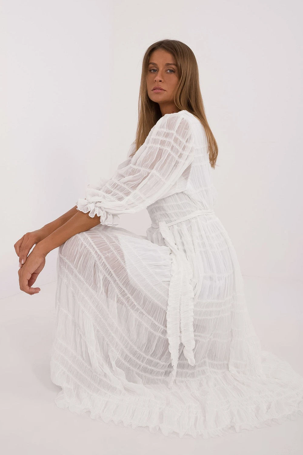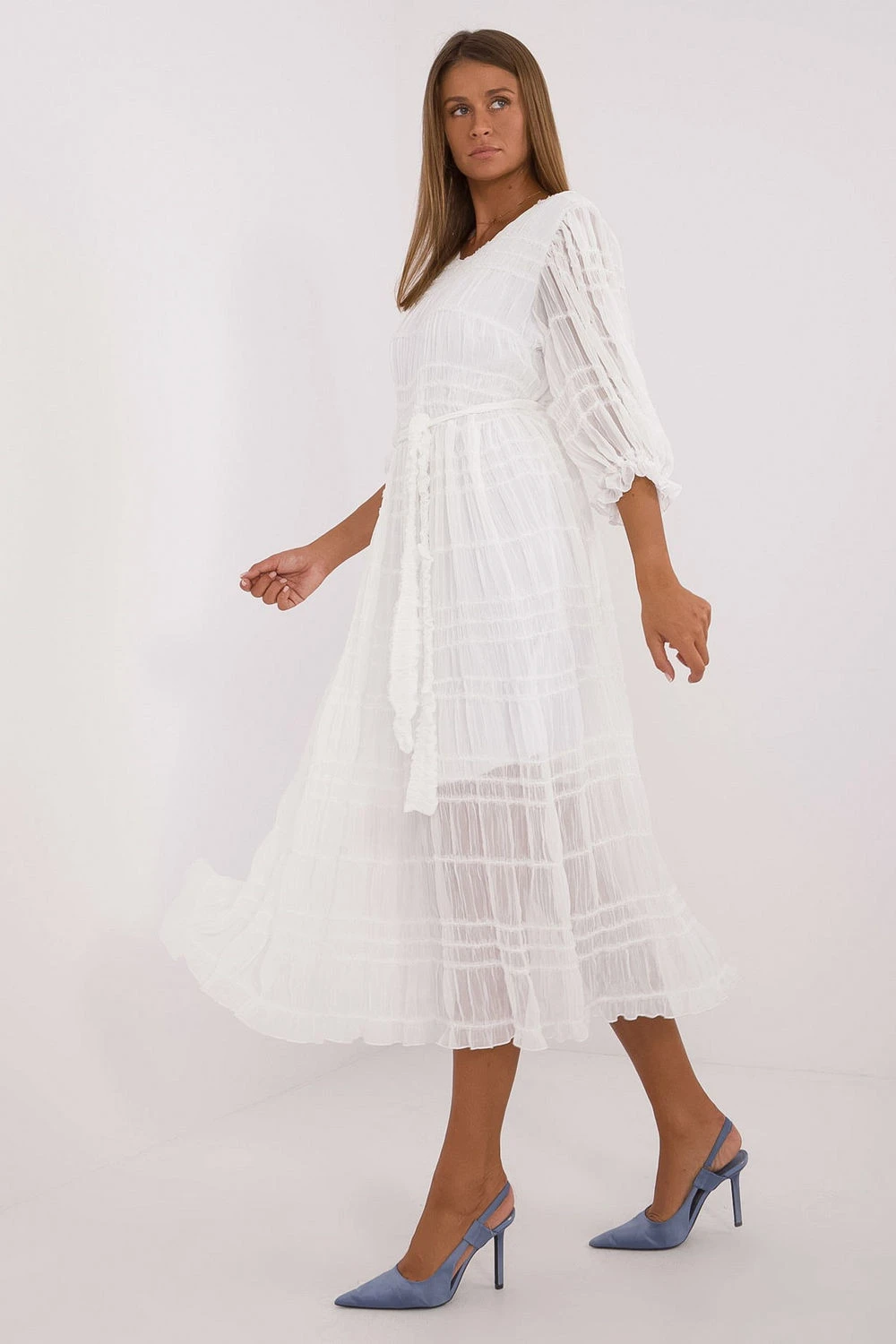 Rozklosowana koktejlová šaty midi délky vyrobené z bavlny s přídavkem nylonu okouzlují elegancí a jemnou strukturou materiálu. Model s kulatým výstřihem a 3/4 rukávem v moderním objemném střihu zdobeným jemnou volánkou spojuje klasiku s ženskými akcenty. Šaty mají podšívku, co zvyšuje pohodlí nošení, a pásek na stahování v pase, který krásně zdůrazňuje postavu. Bez zapínání jsou pohodlné na oblékání. Ideální volba na společenské události, večírky a elegantní setkání.