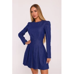 Šaty vyrobené z látky imitující džínovinu jsou elegantní a moderní volbou, ideální na mnoho příležitostí. Materiál je lehce tuhý, matný a mírně elastický, díky čemuž krásně drží tvar a zdůrazňuje střih. Model má klasický, kulatý výstřih a dlouhé rukávy s jemnými záložkami na ramenou, které dodávají siluetě výraz a eleganci. Přizpůsobený vršek plynule přechází do rozkročeného spodku s kontrafašonky, vytvářející ženskou, harmonickou linii. Skrytý zip vzadu zajistí pohodlí při oblékání a absence podšívky zajišťuje, že šaty jsou lehké a pohodlné na nošení. Střih zdůrazňuje pas, zdůrazňuje ramena a krásně modeluje postavu. Mini délka dodává celku moderní charakter a jemně odhaluje nohy, díky čemuž se kreace skvěle hodí jak do každodenního života, tak na speciální události. Navrženo a ušito v Polsku s důrazem na detaily a ženskou siluetu.