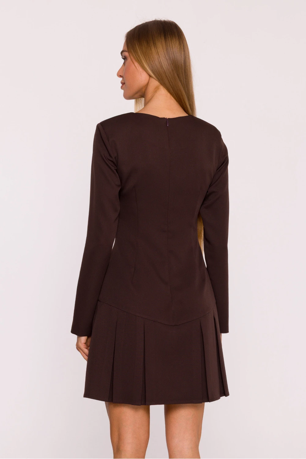 Klasické šaty vyrobené z hladké látky s matným povrchem jsou návrhem, který spojuje jednoduchost a eleganci v moderním provedení. Minimalistický design se skvěle hodí jak do každodenních stylizací, tak i na formální události. Model má decentní dekolt ve tvaru lodičky a dlouhé rukávy, které dodávají celku nadčasový charakter. Šaty se zapínají na skrytý zip na zádech, co zajišťuje pohodlí a estetické provedení. Střih lehce přizpůsobený v horní části byl obohacen spodkem v kontrafałdách, které dodávají siluetě lehkost a ženskou grácii. Jednoduchá, talírovaná linie jemně zdůrazňuje postavu a mini délka dodává šatům moderní, dívčí charakter. Navrženo a ušito v Polsku, vytvořeno s ohledem na ženy, které oceňují nadčasovou eleganci v minimalistické formě.