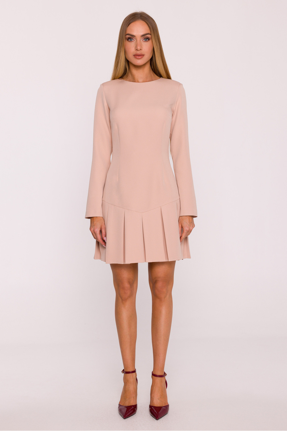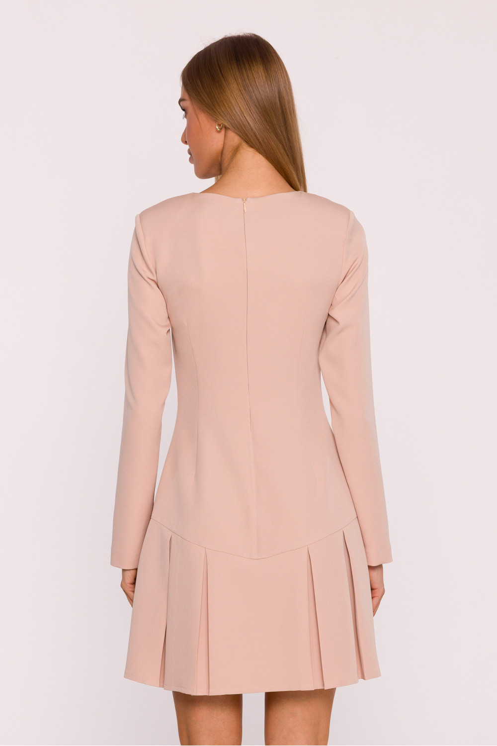 Klasické šaty vyrobené z hladké látky s matným povrchem jsou návrhem, který spojuje jednoduchost a eleganci v moderním provedení. Minimalistický design zaručuje, že se šaty skvěle hodí jak do každodenních outfitů, tak i na formální události. Model má decentní výstřih v podobě lodičkového dekoltu a dlouhé rukávy, které dodávají celku nadčasový charakter. Šaty se zapínají na skrytý zip vzadu, co zajišťuje pohodlí a estetické provedení. Střih je lehce přizpůsobený v horní části a zdobený spodní částí ve volánovém provedení, které dodávají siluetě lehkost a ženský šarm. Jednoduchá, pasovaná linie decentně zdůrazňuje postavu a mini délka dodává šatům moderní, dívčí charakter. Navrženo a ušito v Polsku, vytvořeno pro ženy, které ocení nadčasovou eleganci v minimalistickém provedení.