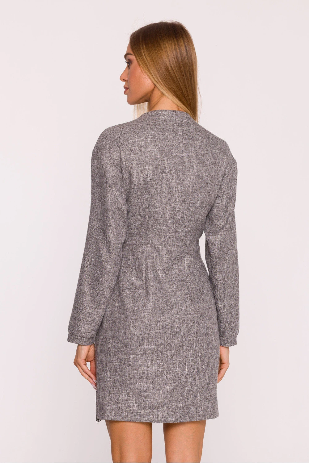 Unikátní šaty vyrobené z tweedové látky s krajkovým doplňkem jsou elegantním návrhem s nádechem moderního charakteru. Melanžový vzor dodává celku šlechetný výraz a krajkový prvek na spodku sukně jemně prolamuje klasický tvar, dodávající mu lehkost a ženskost. Model má hluboký výstřih ve tvaru písmene V, který krásně zdůrazňuje postavu. Dlouhé rukávy dodávají eleganci a záhyb vpředu s vyznačenou talií vytváří efekt štíhlé postavy. Šaty se zapínají na skrytý knoflík uvnitř a ozdobný zlatý knoflík v pasu, který zároveň slouží jako bižuterní detail. Střih je lehce přizpůsobený, s mini délkou, skvěle se hodí jak na speciální příležitosti, tak i do více každodenních, elegantních stylizací. Navrženo a vyrobeno v Polsku, ideální pro ženy, které milují klasiku v unikátním provedení plném detailů.