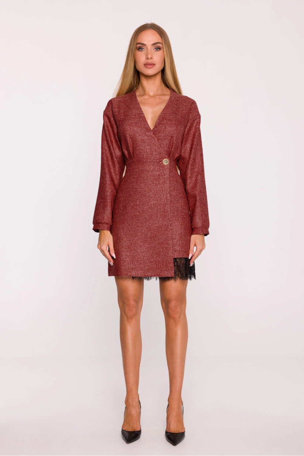 Jedinečné šaty ušité z tweedové látky s prvkem krajky jsou elegantním návrhem s nádechem moderního charakteru. Melanžový vzor dodává celku ušlechtilejší výraz a krajkový prvek dole sukně jemně prolomuje klasickou formu, dodávající jí lehkost a ženskost. Model má hluboký výstřih ve tvaru písmene V, který krásně zdůrazňuje siluetu. Dlouhé rukávy dodávají eleganci a zavinový přední díl s vyznačeným pasem vytváří efekt štíhlé postavy. Šaty se zapínají na skrytý knoflík uvnitř a ozdobným zlatým knoflíkem v pasu, který zároveň představuje bižuterní detail. Střih je lehce přizpůsobený, s mini délkou, skvěle se hodí jak na speciální příležitosti, tak i do více každodenních, elegantních stylizací. Navrženy a ušity v Polsku jsou ideální pro ženy, které milují klasiku v unikátním, plném detailů provedení.