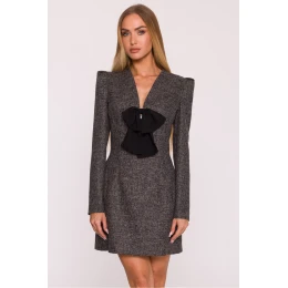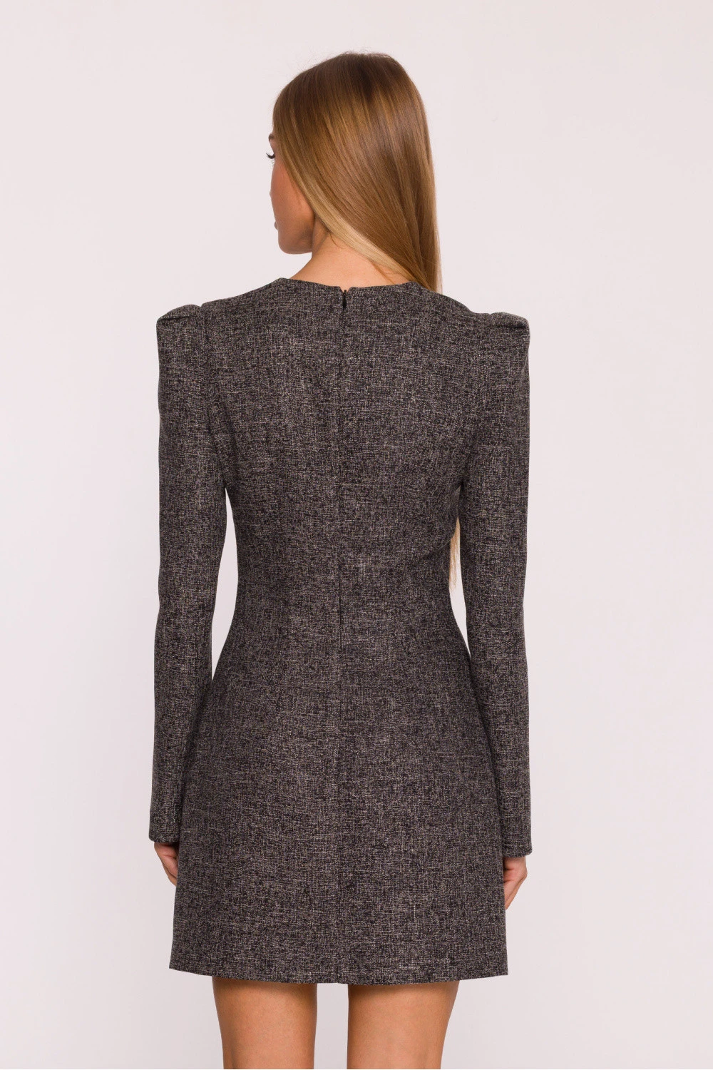 Jedinečné šaty z tweedové látky v melírovém vzoru jsou elegantním návrhem s nádechem moderního charakteru. Strukturovaný materiál se krásně skládá na postavě, dodávajíc celku eleganci a třídu. Model má hluboký výstřih ve tvaru písmene V, který jemně zdůrazňuje ženskou siluetu. Dlouhé rukávy s mírně rozšířenými rameny a náramky dodávají šatům výraznosti a přidávají jim moderní, strukturovaný charakter. Zapínání na skrytý zip na zádech zajišťuje pohodlí a estetické provedení. Výjimečným detailom je ozdobná spona, šifónová mašle s bižuterním přívěskem, která šatům dodává elegantní, bižuterní akcent a dělá je ještě výjimečnějšími. Střih jemně přizpůsobený s více zdůrazněným pasem zdůrazňuje proporce postavy, a mini délka dodává celku lehkost a ženské kouzlo. Navrženo a ušito v Polsku, ideální pro ženy, které oceňují klasiku s moderními, dekorativními detaily.