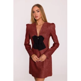 Výjimečné šaty z tweedové látky v melírovém vzoru jsou elegantním návrhem s nádechem moderního charakteru. Strukturovaný materiál se krásně skládá na postavě, dodávajíc celku eleganci a třídu. Model má hluboký výstřih ve tvaru písmene V, který jemně zdůrazňuje ženskou postavu. Dlouhé rukávy s mírně rozšířenými rameny a náramky dodávají šatům výraz a propůjčují jim módní, strukturální charakter. Zapínání na skrytý zip na zádech zajišťuje pohodlí a estetické provedení. Výjimečným detailem je ozdobný prvek, šifonová mašle s bižuterním přívěskem, která šatům dodává elegantní, bižuterní akcent a činí je ještě výjimečnějšími. Střih lehce přizpůsobený s výrazněji zdůrazněnou linií pasu zdůrazňuje proporce postavy, a mini délka dodává celku lehkost a ženský šarm. Navrženo a ušito v Polsku, ideální pro ženy, které ocení klasiku s moderními, dekorativními detaily.