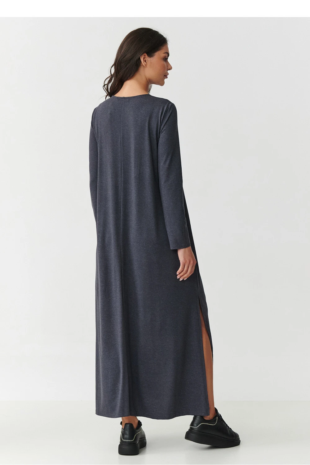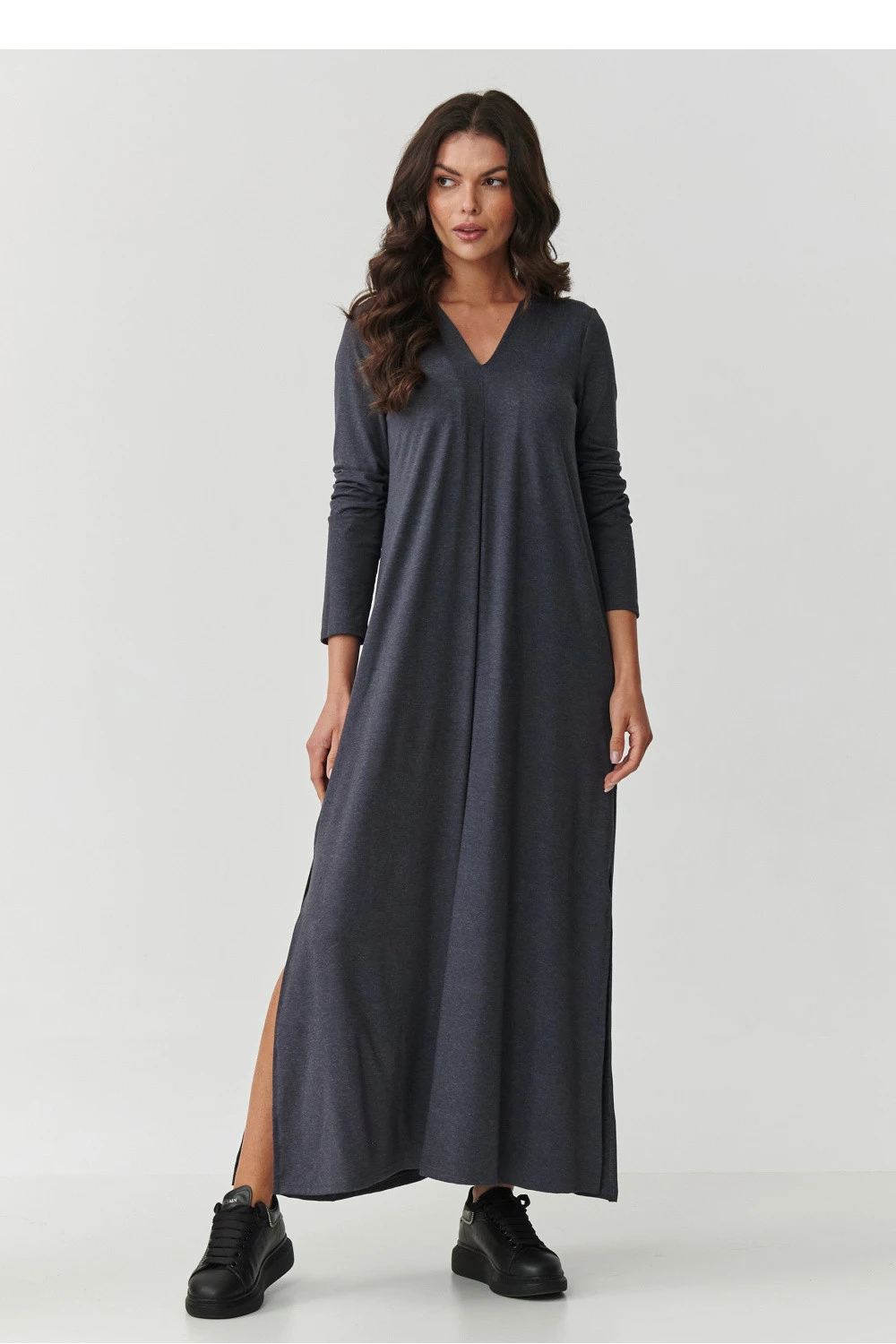Vsadíte na nadčasovou klasiku a maximální pohodlí! Naše dlouhá maxi šaty vyrobené z vysoce kvalitní viskózy s přídavkem elastanu jsou ideální volbou jak pro každodenní nošení, tak i na speciální příležitosti. Díky přírodní prodyšnosti viskózy a pružnosti látky se šaty krásně přizpůsobí postavě, neomezují pohyb. Model má výstřih ve tvaru V, který decentně zdůrazňuje ženské tvary, a lehce rozšířený střih s rozparkem na bocích dodává lehkost a moderní charakter. Dlouhé rukávy zaručují, že se šaty hodí na každou roční dobu - můžete je nosit jak na jaře a v létě, tak i na podzim a v zimě ve spojení s botami nebo kozačkami. K dispozici jsou ve stylových barvách: čokoládová - hluboký, elegantní odstín, který zdůrazňuje krásu a dodává třídu, černá - nadčasová klasika, nenahraditelná v každé skříni, khaki - stylová a univerzální barva v militaristickém stylu a antracit - hluboký, tmavě šedý odstín ideální pro elegantní i každodenní stylizace. Tyto maxi šaty jsou skvělou volbou pro ženy, které ocení pohodlí, minimalismus a elegantní styl. Skvěle vypadají jak s sportovními teniskami, tak s elegantními podpatky.