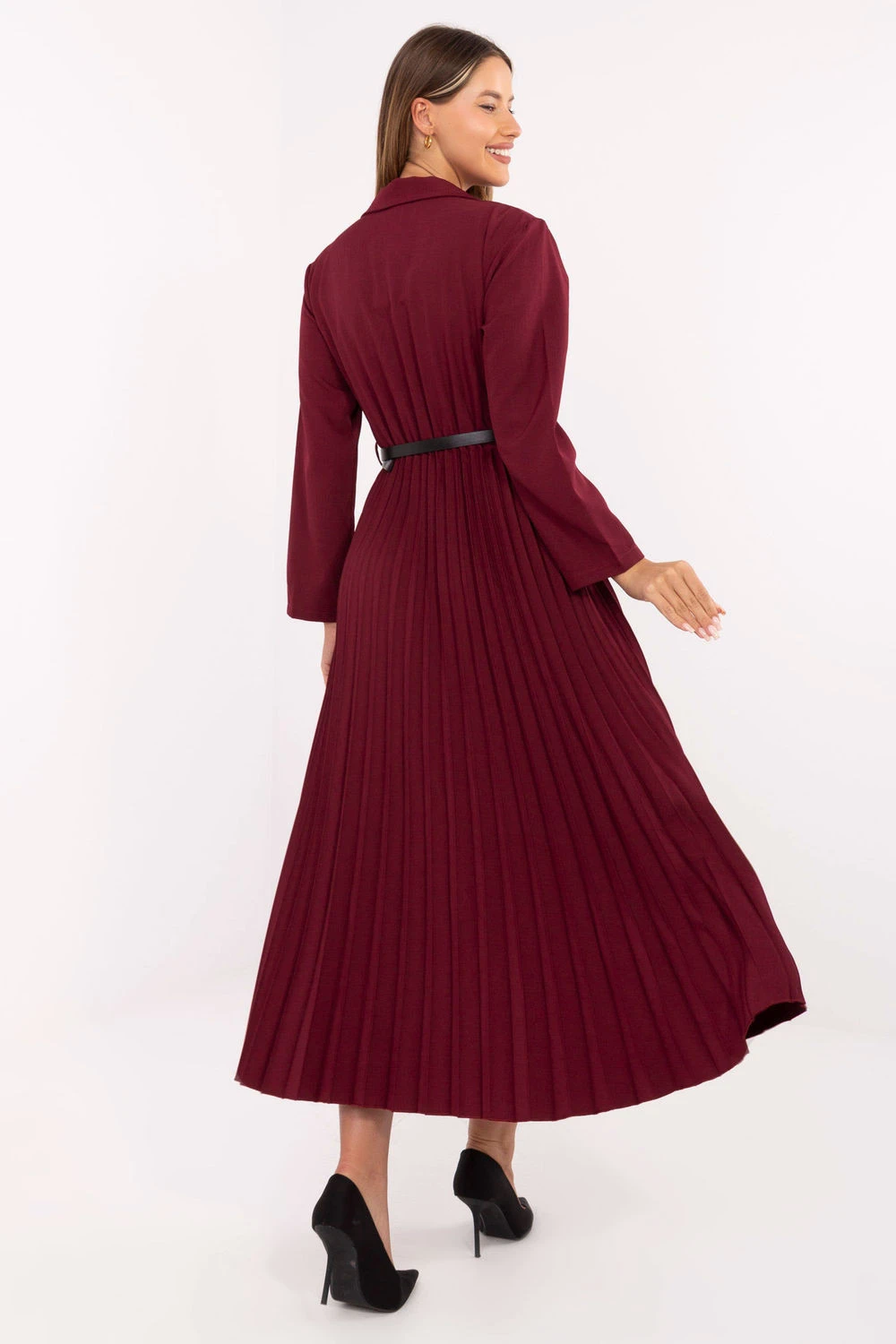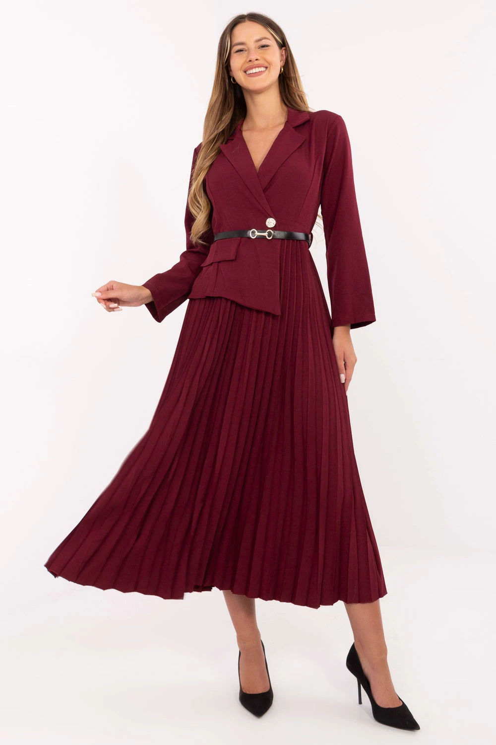 Elegantní maxi šaty ve skladném střihu, ideální jak do práce, tak na společenské události. Horní část v námořnickém stylu s klasickým límečkem a knoflíkem dodává celku eleganci a profesionální charakter. Od pasu dolů jsou šaty vyrobeny z plisované látky, která se krásně pohybuje, zdůrazňuje lehkost a ženskou eleganci. Dlouhé rukávy přidávají eleganci, a zapínací pásek zdůrazňuje pas a dodává postavě proporce. Celý kus je dokončen hladkým povrchem, a dominující směs viskózy a polyesteru zaručuje pohodlí nošení a trvanlivost materiálu.