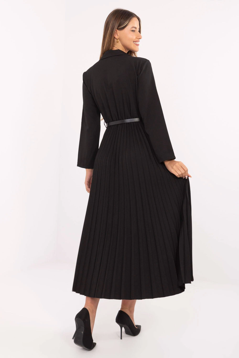 Elegantní maxi šaty ve střihu rozkročeného střihu, ideální jak do práce, tak na slavnostní příležitosti. Horní část v námořnickém stylu s klasickým límečkem a knoflíkem dodává celku eleganci a profesionální charakter. Od pasu dolů jsou šaty vyrobeny z plisované látky, která se krásně skládá při pohybu, zdůrazňujíc lehkost a ženskou eleganci. Dlouhé rukávy přidávají eleganci, a zapínací pásek zdůrazňuje pas a dává postavě proporci. Celkový vzhled je udržován v hladkém zpracování a dominující směs viskózy a polyesteru zajistí pohodlí nošení a odolnost materiálu.