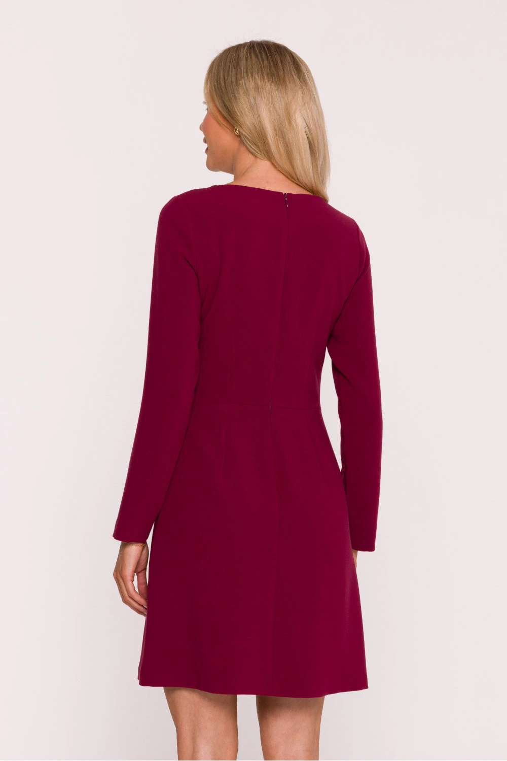 Elegantní šaty ušité z hladké látky s jemným zpracováním, které krásně padnou na postavu. Klasický, zaoblený výstřih a dlouhé rukávy jí dodávají nadčasový charakter. Přizpůsobený vršek jemně zdůrazňuje pas, zdůrazněný dalšími límci s ozdobnými zlatými knoflíky. Spodek ve tvaru jemného písmene A se lehce rozšiřuje dolů, vytvářející trapezový střih, který spojuje eleganci s pohodlím nošení. Skrytý zip na zádech zajišťuje pohodlí a estetické zpracování, a délka nad koleno činí tyto šaty ideální jak na obchodní schůzky, tak i na formální příležitosti. Navrženo a ušito v Polsku.