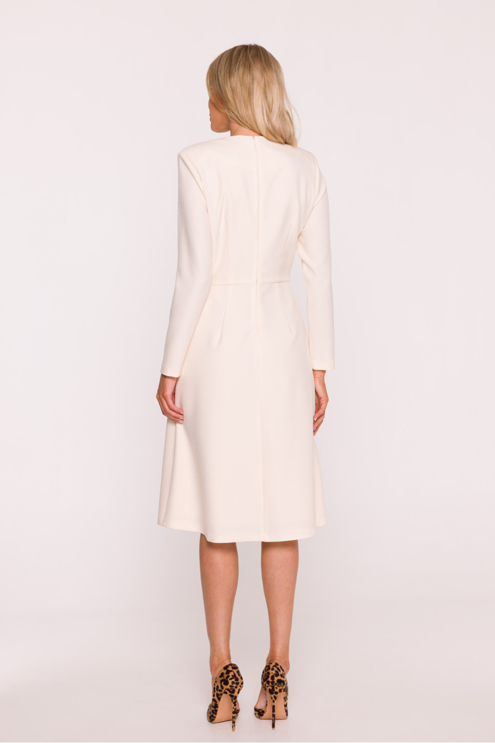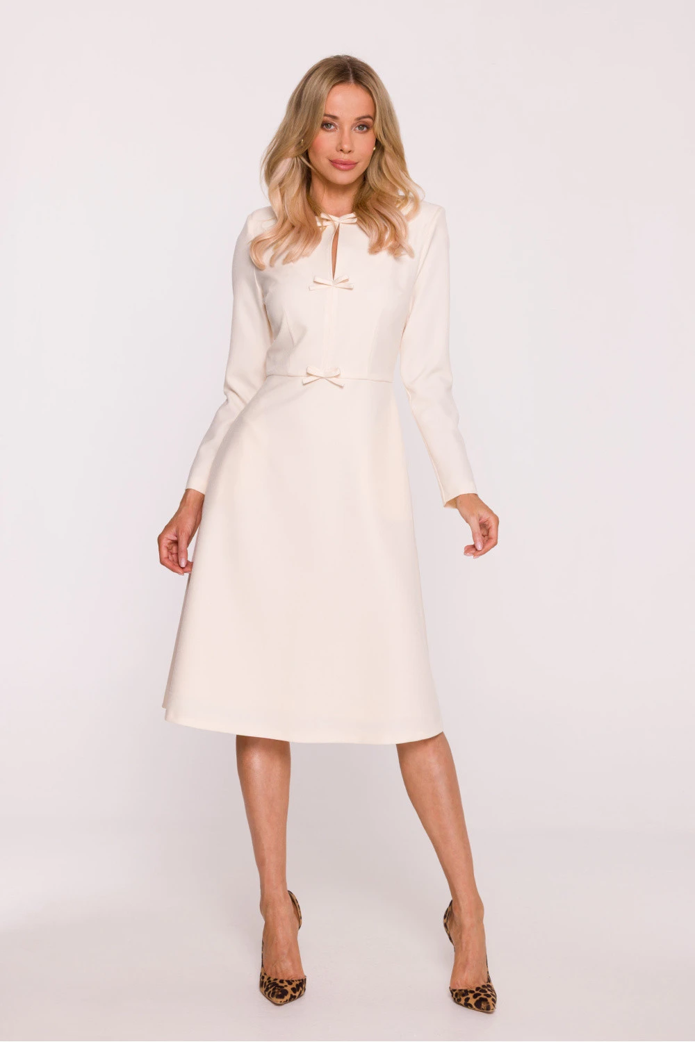 Elegantní šaty vyrobené z hladké látky, celé vybavené podšívkou, která zajišťuje pohodlí nošení a ideální uspořádání materiálu. Polokruhový výstřih pod krk s jemným rozparem dodává celku jemný akcent, zatímco dlouhé rukávy zdůrazňují klasický charakter modelu. Široký střih ve tvaru písmene A zaručuje pohodlí a lehkost, zatímco ozdobné mašličky na přední straně dodávají šatům dívčí grády a výjimečnou eleganci. Volný spodní díl v bocích a délka pod kolena dělají tento model mimořádně univerzálním a hodí se na mnoho příležitostí, od rodinných setkání po formální události. Navrženo a ušito v Polsku.