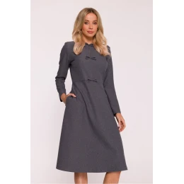 Šaty ve tvaru trapezu, ušité z hladké látky s jemnou melírovou strukturou. Polo-kulatý výstřih pod krkem je oživen jemným rozparkem, který celku dodává lehkost. Dlouhé rukávy zdůrazňují elegantní charakter modelu, a praktické kapsy skryté v bočních švech zvyšují pohodlí nošení. Na přední straně zdobí ozdobné mašličky umístěné uprostřed, které šatě dodávají dětský šarm a výjimečné zpracování. Volnější spodní část v bocích ve tvaru písmene A a délka za koleno dělají střih působit uvolněně a zároveň stylově. Model bez podšívky, zapínání na skrytý zip vzadu, se skvěle hodí jak na každý den, tak i na formálnější příležitosti. Navrženo a ušito v Polsku.