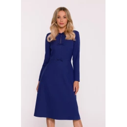 Šaty ve tvaru trapezu, ušité z hladké látky s jemnou melanžovou strukturou. Polooblý výstřih na krku je doplněn jemným rozparkem, který celku dodává lehkost. Dlouhé rukávy zdůrazňují elegantní charakter modelu a praktické kapsy skryté v bocích zvyšují pohodlí nošení. Na přední straně zdobí ozdobné mašle umístěné uprostřed, které šaty dodávají dívčí půvab a výjimečné provedení. Volnější spodek v bocích ve tvaru písmene A a délka za kolena dodávají střihu volnost a zároveň styl. Model bez podšívky, zapínání vzadu na skrytý zip, se skvěle hodí jak na každý den, tak i na formální události. Navrženo a ušito v Polsku.