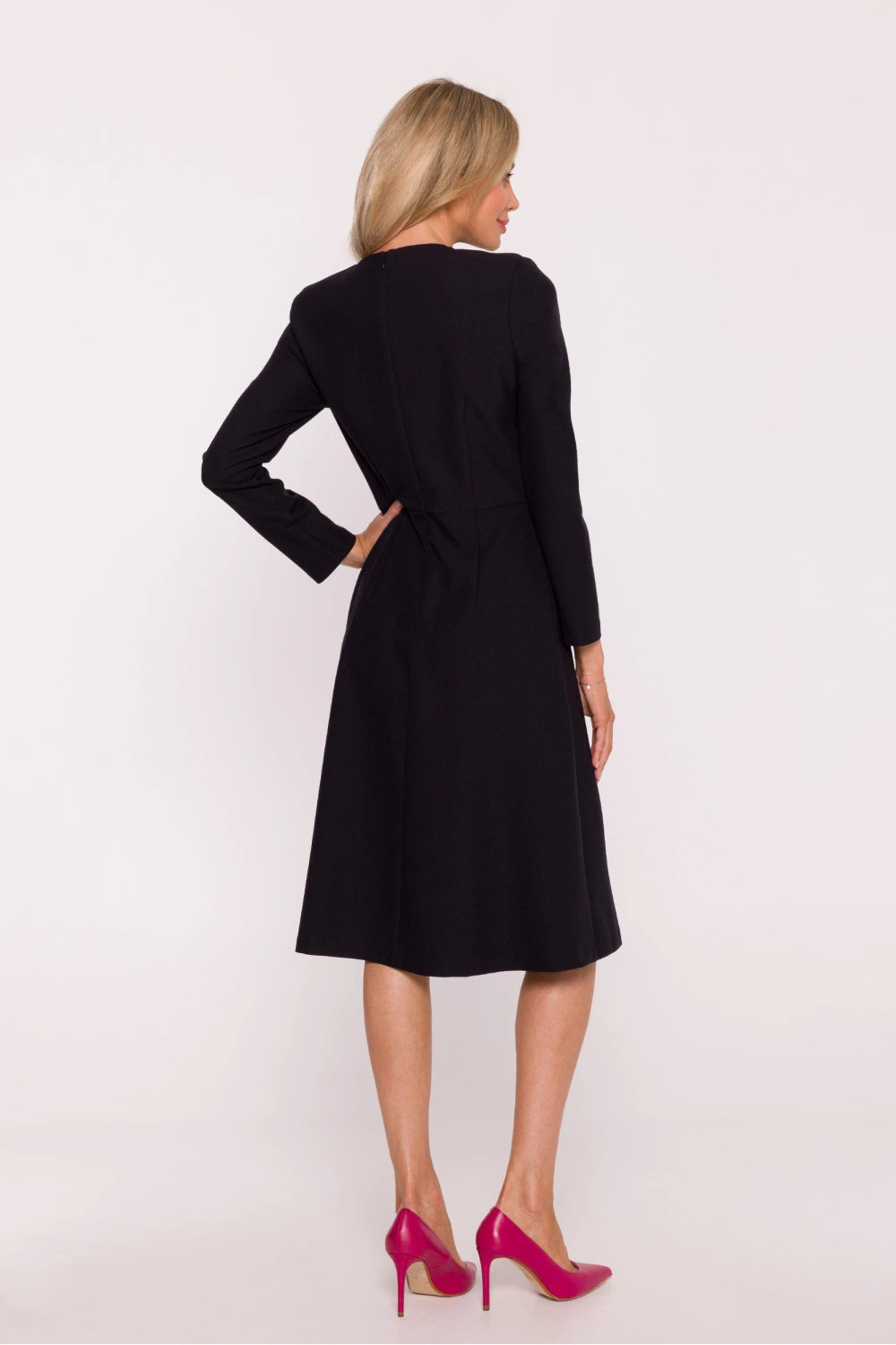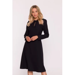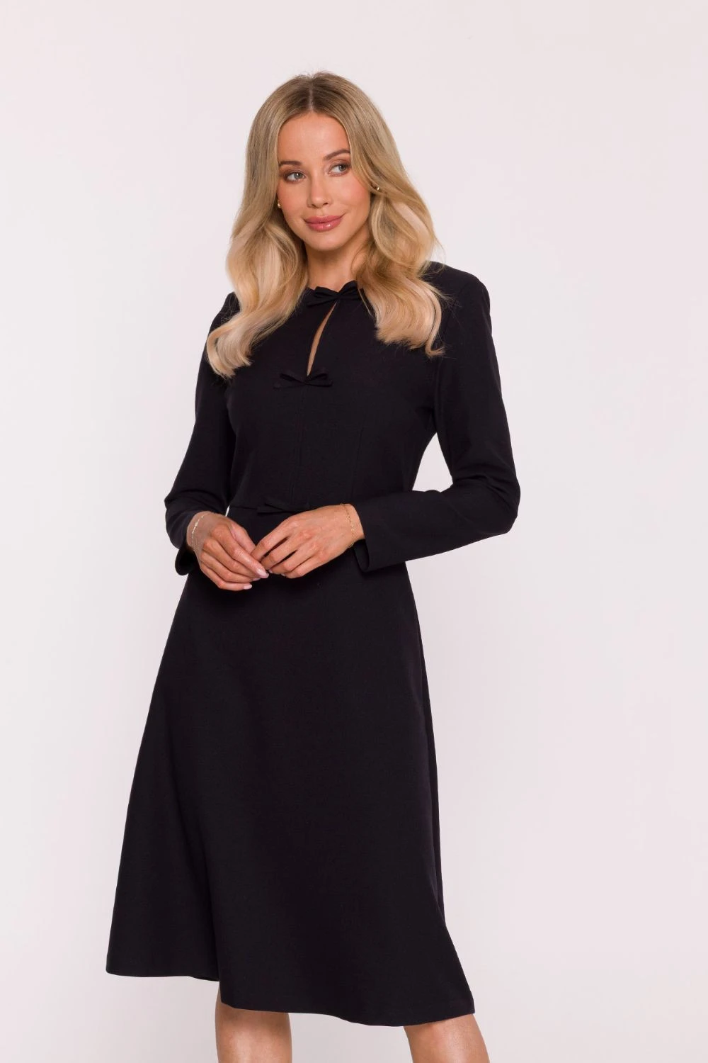 Šaty s trapezovým střihem, ušité z hladké látky s jemnou melírovou strukturou. Polooblý výstřih pod krkem je oživen jemným rozparem, který dodává celku lehkost. Dlouhé rukávy zdůrazňují elegantní charakter modelu a praktické kapsy skryté v bocích zvyšují pohodlí nošení. Na přední straně zdobí ozdobné mašličky umístěné uprostřed, které šatě dodávají dívčí šarm a výjimečné zakončení. Volnější spodek v bocích ve tvaru písmene A a délka pod kolena dělají střih vypadat uvolněně a zároveň stylově. Model bez podšívky, zapínání na skrytý zip vzadu, se skvěle hodí jak na každý den, tak i na formální události. Navrženo a ušito v Polsku.