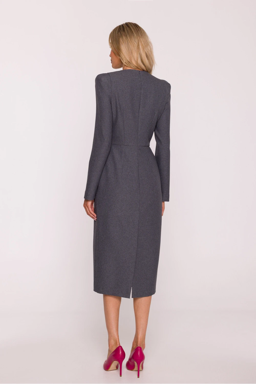 Elegantní šaty ve střihu ceruzky, ušité z hladké látky s melírovou strukturou. Klasický kulatý výstřih a dlouhé rovné rukávy dodávají celku eleganci, a polštářky ve švech ramen jemně zdůrazňují siluetu, vytvářejí moderní, výraznou linii. Přizpůsobený střih lehce se zužující ke dnu krásně tvaruje postavu, a vysoký rozpark vzadu zajistí volnost pohybu a přidává smyslný charakter. Šaty jsou celkově vybaveny podšívkou, skvěle padnou a zaručují pohodlí nošení. Délka nad koleno z nich činí ideální volbu jak pro obchodní stylizace, tak na formální události. Skrytý zip vzadu zajistí estetické dokončení. Navrženo a ušito v Polsku.