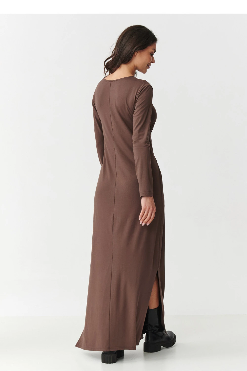 Maxi šaty z viskózy spojují pohodlí a nadčasovou eleganci. Měkký, prodyšný materiál je velmi pohodlný na nošení po celý den, dlouhé rukávy a efektní vázání v pasu krásně zdůrazňují postavu. Kulatý výstřih se hodí ke všem typům postav a stylům. Jemné rozparky po stranách dodávají lehkost a ženský charakter, zároveň zajišťují volnost pohybu. Tento model se skvěle hodí jak do každodenního života, do práce, tak i na setkání s přáteli. Stačí změnit doplňky, abyste stylizaci dodali více ležérního nebo elegantního charakteru. Díky klasickým barev, antracitu, černé, bordó, khaki a čokoládové, snadno ji sladíte se svým šatníkem a vytvoříte mnoho jedinečných outfitů. Maxi šaty s vázáním v pasu jsou návrhem, který spojuje moderní vzhled, pohodlí a univerzálnost. Skvěle vypadají jak s botkami a koženou bundou, tak i v kombinaci s elegantními podpatky nebo sportovními teniskami.
