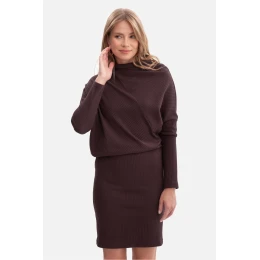 Šaty vyrobené z vysoce kvalitního žakárového materiálu o gramáži 250 g, který krásně padne a poskytuje pohodlí při nošení. Model nasazovaný přes hlavu, bez kapes a podšívky, díky čemuž zůstává lehký a pohodlný. Vysoký stojáček s měkkým lemováním dodává šatům zvláštní charakter, jemně obepínající krk. Dlouhé, netopýří rukávy se zužují ke dnu, vytvářejíce efektní linii ramen, a volnější vrchní část spolu s přiléhavým, tužkovým spodkem dává šatům bluzový střih, který zdůrazňuje pas a zjemňuje postavu. Minidélka sahající před kolena dělá šaty ideální kombinací elegance a ženské lehkosti. Navrženo a ušito v Polsku z materiálu vyrobeného v Lodži, je to nabídka pro ženy, které oceňují místní řemesla, vysokou kvalitu a nadčasový styl.