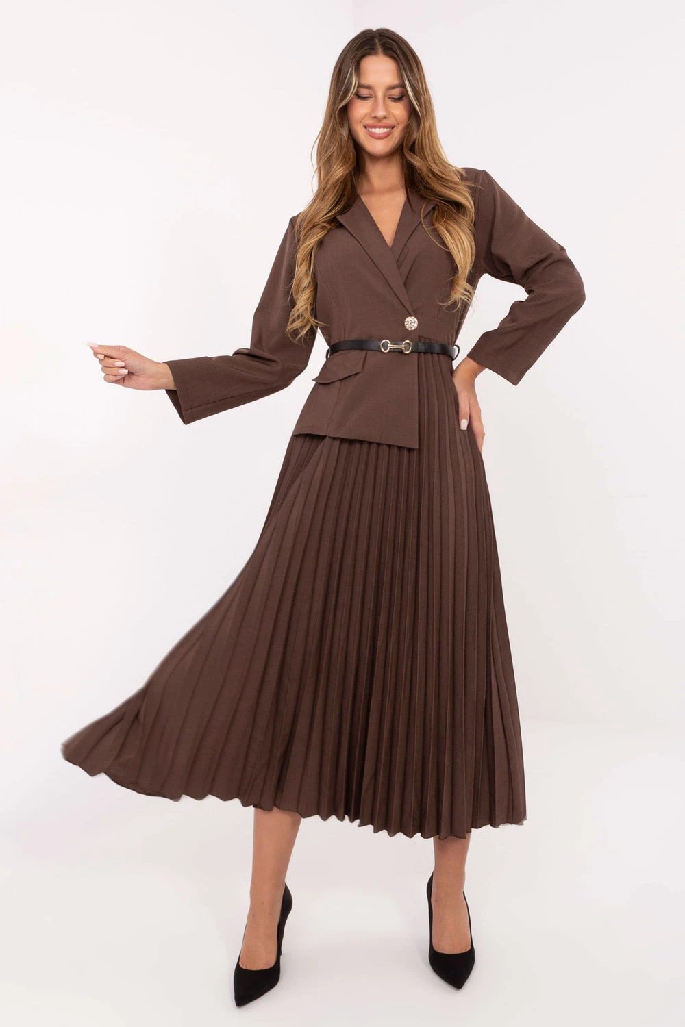Elegantní maxi šaty s rozšířeným střihem, ideální jak do práce, tak na formální události. Horní část v námořnickém stylu s klasickým límcem a knoflíkem dodává celému outfitu eleganci a profesionální charakter. Od pasu dolů je šaty vyrobeny z plisované látky, která se krásně skládá při pohybu, zdůrazňujíc lehkost a ženskou eleganci. Dlouhé rukávy přidávají eleganci, a zapínací pásek zdůrazňuje pas a dodává siluetě proporce. Celkový vzhled je udržován v hladkém provedení, a dominantní směs viskózy a polyesteru zajišťuje pohodlí nošení a trvanlivost materiálu.
