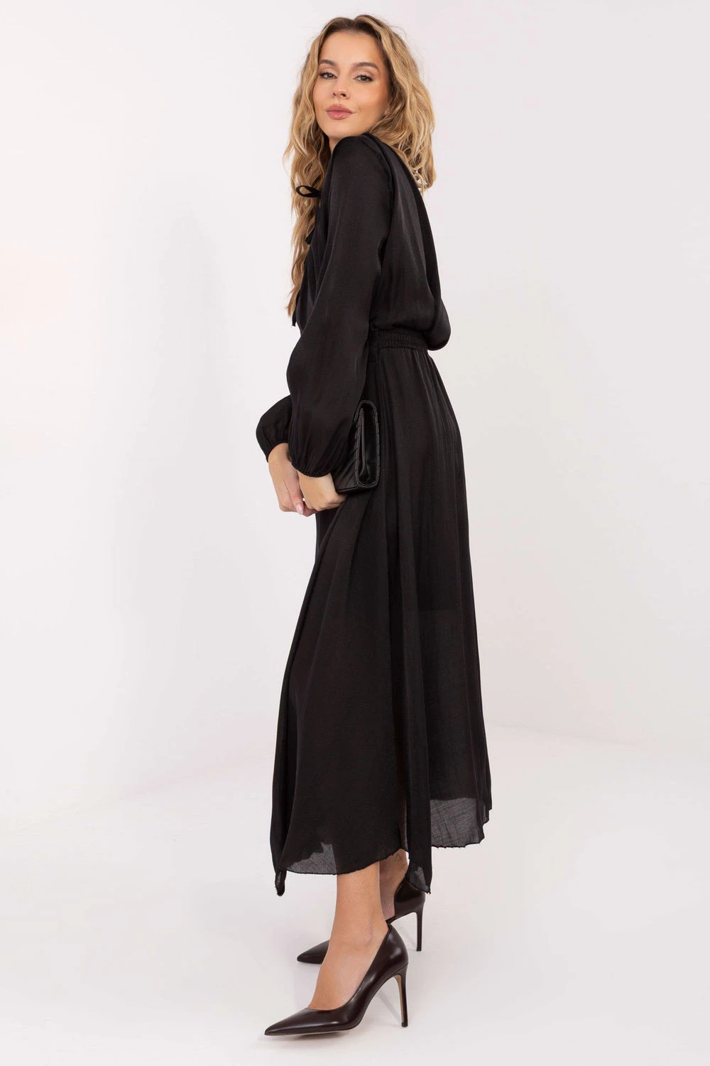 Elegantní šaty ve střihu rozkroku jsou stylovým návrhem vhodným na každý den, do práce a na slavnostní příležitosti. Vyrobené z kombinace lyocellu a polyesteru se krásně skládají na postavě, poskytují pohodlí a jemný, plynulý efekt. Model má podšívku, která zvyšuje pohodlí nošení a zdůrazňuje kvalitu zpracování. Šaty okouzlují hladkým zpracováním a do detailu propracovanými detaily. V pasu je široký šátek k zavázání, který efektně modeluje pas a dodává celku elegantní charakter. Vložené polštářky na ramenou dávají postavě výraznou linii a moderní proporce. Dlouhý rukáv a výstřih s vázáním dodávají šatům ženský, stylový vzhled, zatímco maxi délka zdůrazňuje jejich eleganci a nadčasovost. Bez zapínání je model pohodlný a snadno se obléká. Jedná se o ideální šaty pro ženy, které oceňují eleganci, pohodlí a rafinované detaily.