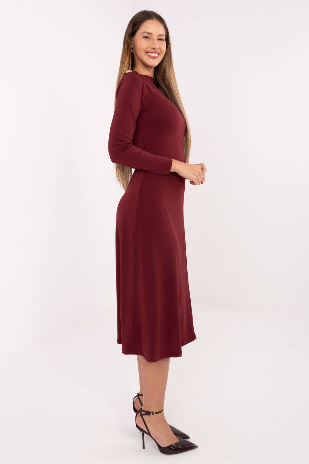 Elegantní midi šaty, ideální na různé příležitosti od každodenních vycházek přes pracovní stylizace až po společenská setkání. Vyrobené z dominující směsi polyesteru a viskózy, poskytují pohodlí nošení, prodyšnost a jemné přizpůsobení se postavě. Model se vyznačuje hladkým, klasickým vzorem, který zdůrazňuje nadčasový charakter šatů. Dekolt typu loděnice dodává celku jemnou eleganci, zatímco dlouhý rukáv zajišťuje, že kreace skvěle funguje v každém ročním období. K výjimečné eleganci přispívají kovové ozdobné prvky umístěné na pravém rameni a na levém straně v pasu. V těchto místech jsou šaty také zdobeny jemnými záhyby, které krásně modelují postavu a přitahují pozornost. Šaty nemají zapínání, díky čemuž jsou pohodlné na oblékání a přirozeně se tvarují na těle. Jedná se o skvělý návrh pro ženy, které oceňují klasiku s nádechem moderních detailů.