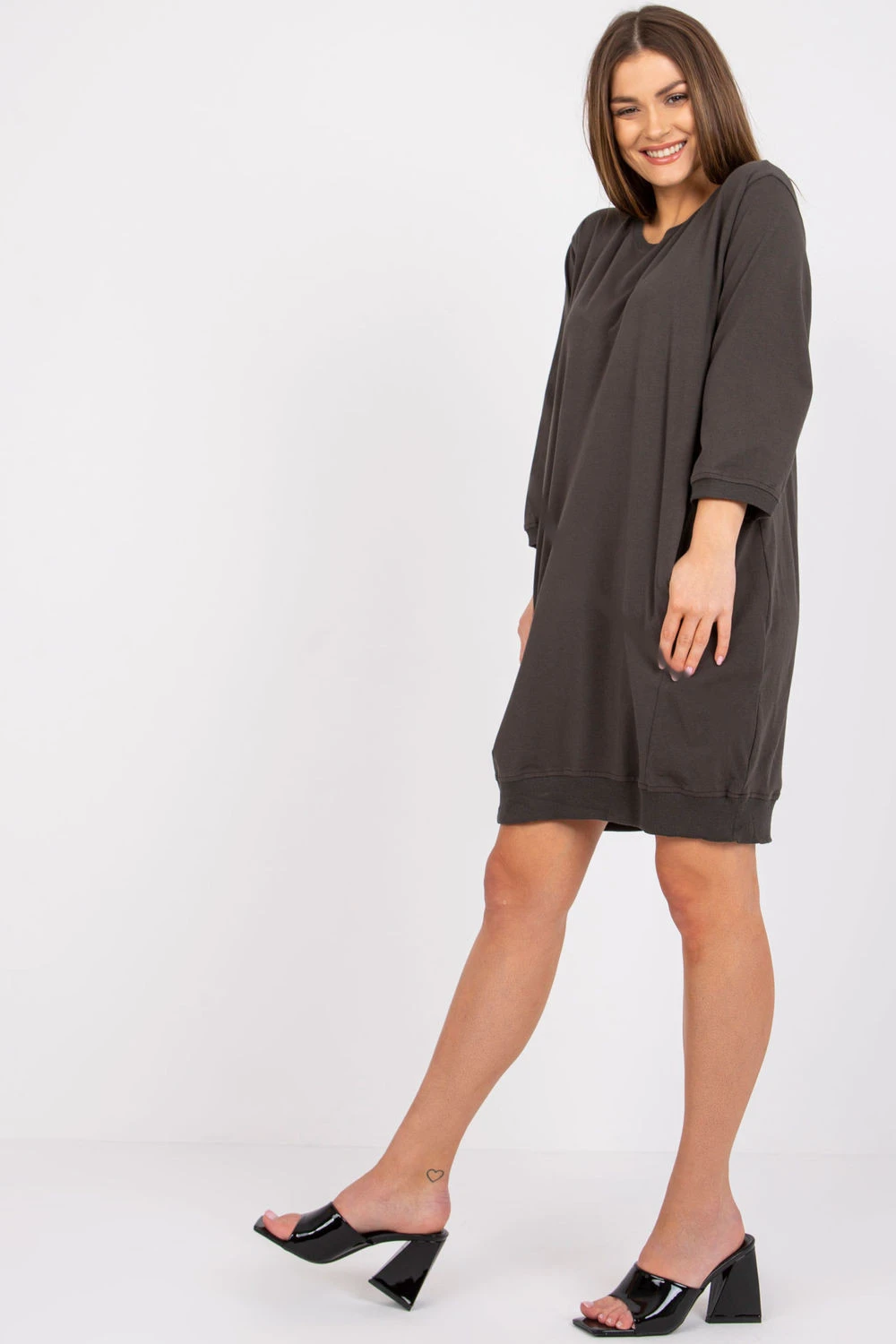 Každodenní šaty v casual stylu s volným střihem jsou ideální volbou pro každodenní outfit, spojující pohodlí s moderním, minimalistickým vzhledem. Vyrobené z vysoce kvalitní bavlny s přídavkem elastanu jsou měkké, prodyšné a jemně elastické, díky čemuž se skvěle přizpůsobují postavě a zajišťují plný komfort nošení. Model má kulatý výstřih a praktický 3/4 rukáv, který šatě dodává lehký, uvolněný charakter. Hladký materiál zdůrazňuje jednoduchý, casual styl, umožňující snadné sladění doplňků a obuvi. Praktickým prvkem jsou našité kapsy, které přidávají pohodlí a funkčnost do každodenního nošení. Šaty nemají zapínání, nasazují se přes hlavu, což z nich činí rychlý a pohodlný výběr na každý den. Jsou ideální volbou pro ženy oceních volnost, pohodlí a nadčasovou jednoduchost v sportovním provedení.