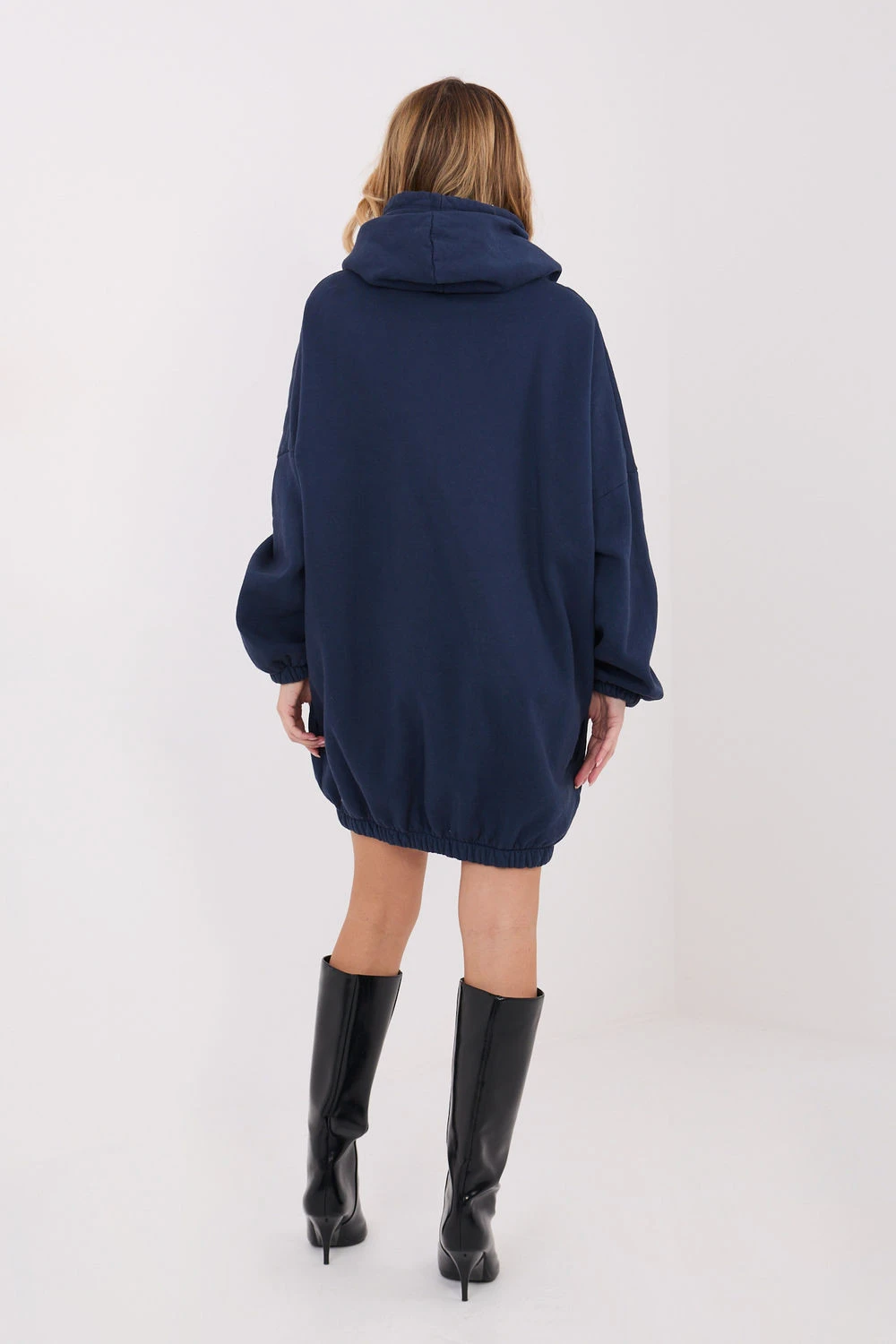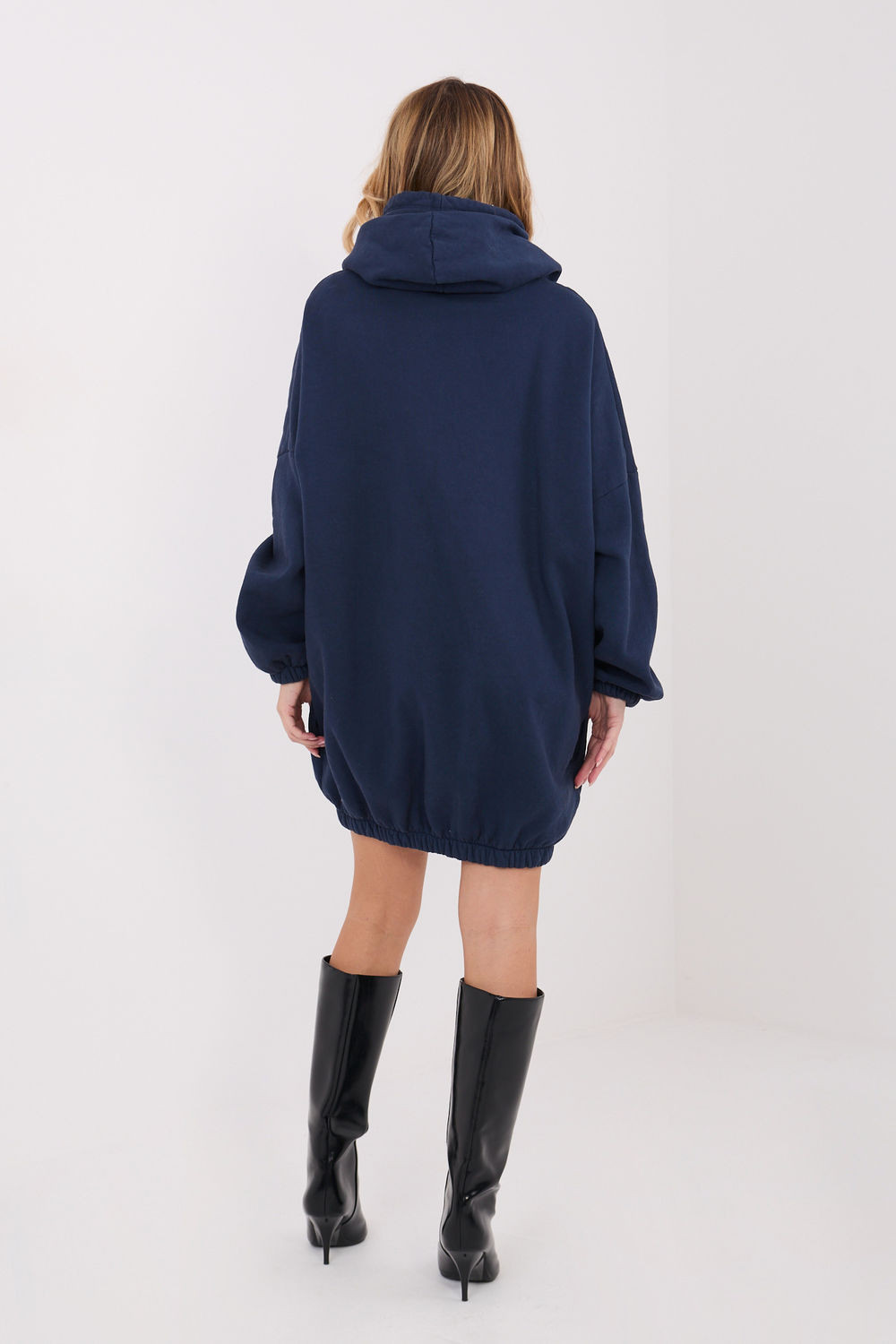 Tříčtvrteční šaty ve stylu oversize jsou pohodlným a stylovým návrhem pro každodenní stylizace. Vyrobené z vysoce kvalitní bavlny s přídavkem elastanu zajistí pohodlí nošení, pružnost a volnost pohybu. Hladký vzor zdůrazňuje její univerzální charakter a umožňuje snadné sladění s různými doplňky. Model s mini délkou, dlouhými rukávy a praktickou kapucí se obléká přes hlavu. Vsazený gumový lem na spodní části jemně sbírá šaty, dodává jim moderní vzhled a lehce sportovní charakter. Zateplení zajistí teplo v chladnějších dnech a kapsy skryté v bočních švech zvyšují funkčnost. Ideální návrh na každý den, k nošení s teniskami, sneakers nebo botami.