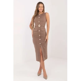 Elegantní každodenní šaty ve střihu ceruzky jsou univerzální volbou pro každý den i do práce. Vyrobené ze směsi viskózy, nylonu a elastanu poskytují pohodlí, pružnost a elegantní přizpůsobení postavě. Model midi délky, bez rukávů, s kulatým výstřihem a zakrytým zipem na zadní straně, zaručuje pohodlí a elegantní dokončení. Šaty mají nášitné kapsy se sklápěcími kapsami, které přidávají praktičnost, a ozdobné knoflíky vpředu zavádějí jemný dekorační prvek. Jemné štěrbiny vpředu na spodní části dodávají celku lehkost a usnadňují pohyb, zdůrazňujíce ženskou siluetu elegantním způsobem.