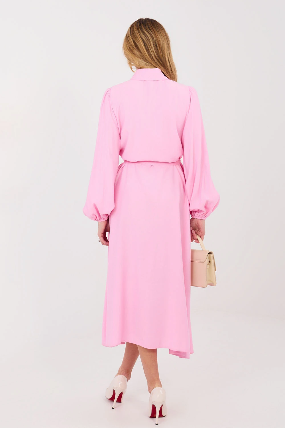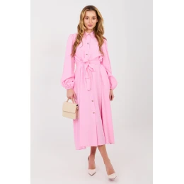 Šaty košilového střihu s rozšířeným střihem, vyrobené z vysoké kvality směsi bavlny, elastanu a viskózy, co zajišťuje pohodlí, pružnost a elegantní vzhled. Model midi délky s dlouhým, lehce nafouklým rukávem, límečkem a knoflíkovým zapínáním vpředu. Šaty mají praktické kapsy a vázaný pásek v pasu, který zdůrazňuje siluetu. Hladký vzor dělá šaty skvěle vhodné jak do práce, tak i na formální události.