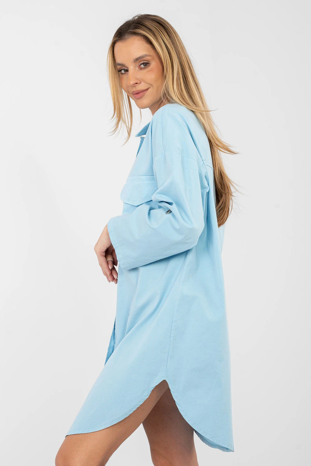 Pohodlné košilové šaty s voľným strihom, ideálne na každodenné outfit. Model so zapínaním na gombíky a klasickým golierom, ktorý dodáva celej sukničke nadčasový charakter. Hladký vzor robí šaty neuveriteľne univerzálne a ľahko kombinovateľné. Vyrobené z príjemnej bavlny s prídavkom elastanu, zabezpečuje pohodlie pri nosení a voľnosť pohybu. Dlhý rukáv s možnosťou zavinutia umožňuje prispôsobiť šaty ročnému obdobiu a individuálnym preferenciám. Dĺžka nad kolená a spodok jemne zaoblený podčiarkuje siluetu a dodáva ľahkosť. Na prednej strane sú praktické vrecká s klopami, ktoré zdôrazňujú ležérny štýl šiat. Skvelý návrh na každý deň do práce, na prechádzku alebo stretnutie v uvoľnenej atmosfére.