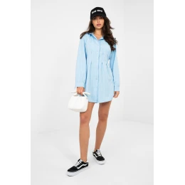 Elegantní košilové šaty s knoflíky jsou stylovým návrhem pro ženy, které ocení klasiku v moderním provedení. Model s mini délkou a rozkročeným střihem krásně zdůrazní pas a dodá postavě lehkost a proporcionálnost. Šaty jsou vyrobeny z vysoce kvalitní směsi polyesteru, viskózy a elastanu, díky čemuž jsou pohodlné, jemně elastické a dobře padnou na postavu. Pruhovaný vzor dodává šatům nadčasový charakter a decentní eleganci. Model má klasický límec a dlouhý rukáv, co podtrhuje košilový styl a činí šaty ideální jak do práce, tak na formální události. Na přední straně jsou ozdobné švy, zatímco zástřihy na zádech v oblasti pasu navíc zdůrazňují pas a zajišťují lepší přizpůsobení. Jedná se o univerzální model, který spojuje eleganci s pohodlím, ideální jak do kanceláře, tak na speciální události.