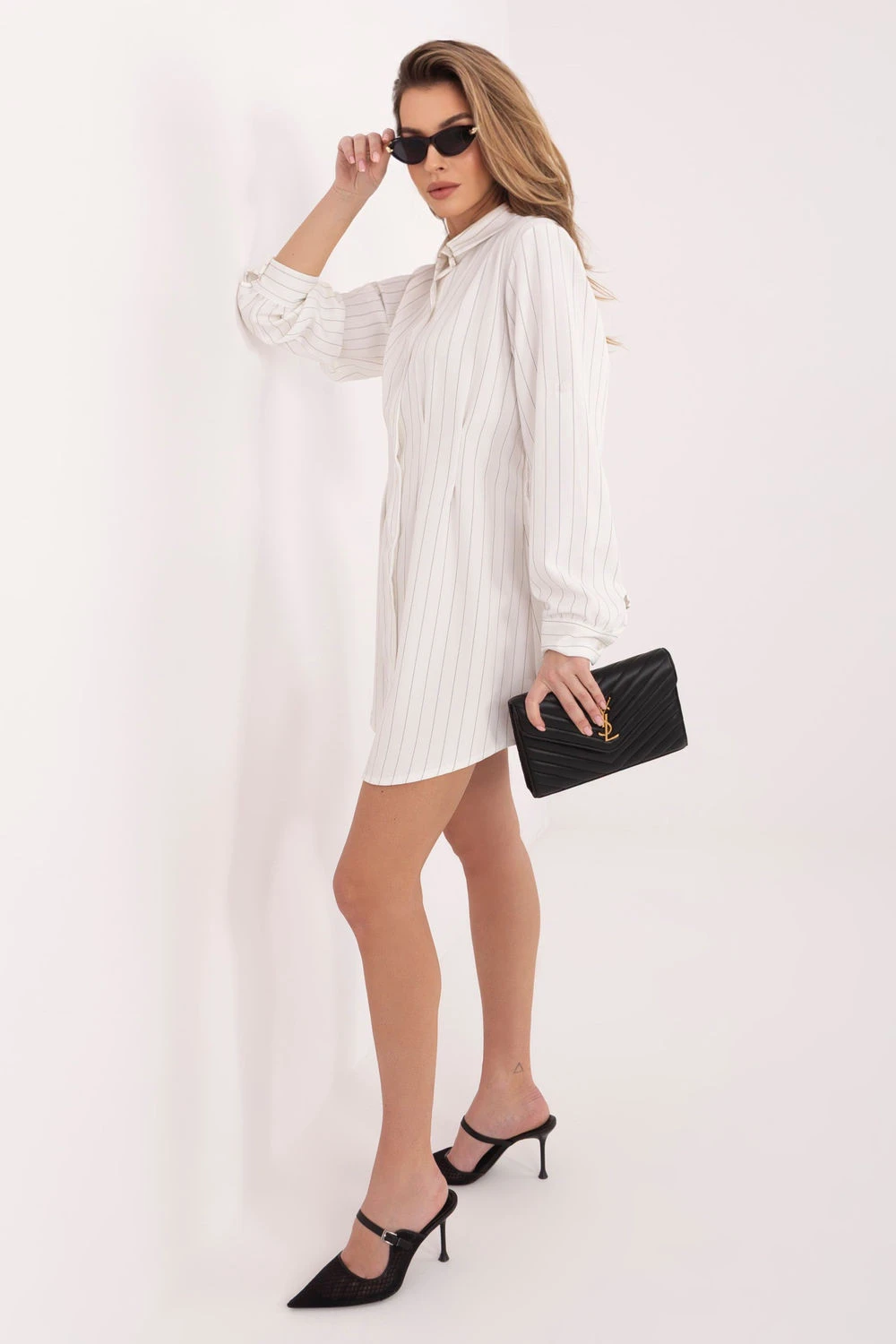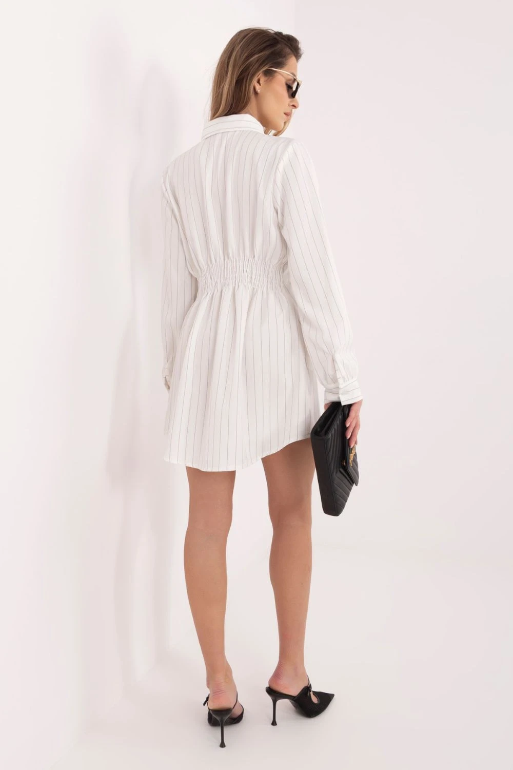 Elegantní košilové šaty s knoflíky jsou stylovým návrhem pro ženy, které ocení klasiku v moderním provedení. Mini model s rozšířeným střihem krásně zdůrazňuje pas a dodává postavě lehkost a proporcionálnost. Šaty jsou vyrobeny z vysoce kvalitní směsi polyesteru, viskózy a elastanu, díky čemuž jsou pohodlné, jemně elastické a dobře padnou na postavě. Pruhový vzor jim dodává nadčasový charakter a jemnou eleganci. Model má klasický límec a dlouhý rukáv, co zdůrazňuje košilový styl a dělá šaty ideální jak do práce, tak na formální příležitosti. Vpředu jsou ozdobné švy, zatímco záhyby na zádech v oblasti pasu dále zdůrazňují pas a zajistí lepší přizpůsobení. Jedná se o univerzální model, který spojuje eleganci s pohodlím, ideální jak do kanceláře, tak na speciální výstupy.