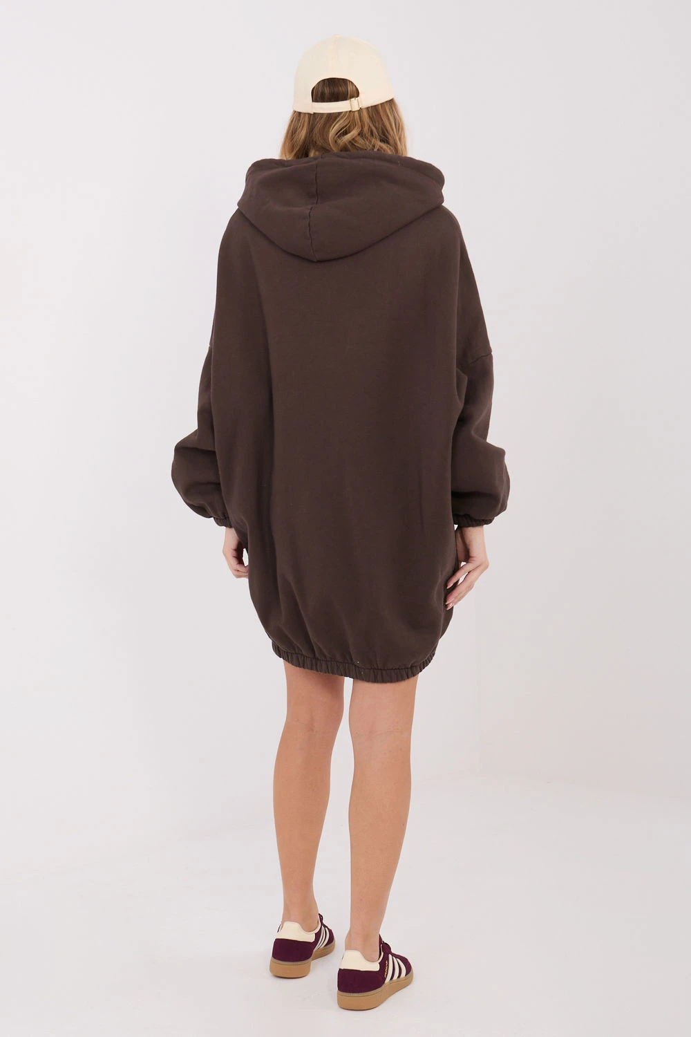 Trenýrkové šaty ve stylu oversize jsou pohodlným a stylovým návrhem pro každodenní outfit. Vyrobené z vysoké kvality bavlny s přídavkem elastanu, zaručují pohodlí nošení, pružnost a volnost pohybu. Hladký vzor zdůrazňuje jejich univerzální charakter a usnadňuje snadné sladění s různými doplňky. Model s mini délkou, dlouhými rukávy a praktickou kapucí se obléká přes hlavu. Vsazený elastický pás jemně sbírá šaty dole, dodávajíc jim moderní vzhled a lehce sportovní charakter. Zateplení poskytuje teplo v chladnějších dnech a kapsy skryté v bočních švech zvyšují funkcionalitu. Ideální volba na každý den, k nošení s teniskami, sneakers nebo kotníčkovými botami.