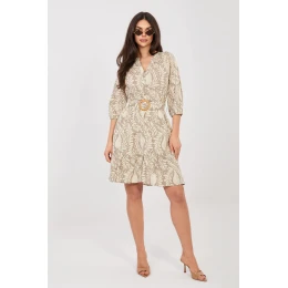 Elegantní šaty po kolena vyrobené z příjemné, lehké viskózy, která se krásně přizpůsobuje postavě a zajišťuje pohodlí po celý den. Model s dominujícím potiskem látky přitahuje pozornost a dodává outfitu výrazný charakter. Střih s výstřihem do "V" decentně zdůrazňuje linii krku, a zapínání na tři knoflíky vpředu dodává celku jemný, klasický akcent. Rukáv délky 3/4 s nafouklým zakončením přináší romantický styl a lehkost. Šaty mají zapínací pásek, který zdůrazňuje pas a přizpůsobí střih postavě. Spodek s volánem dodává celku lehkosti a ženského šarmu. Další podšívka zvyšuje pohodlí nošení a zajišťuje, že se materiál lépe přizpůsobuje. Ideální volba na každý den, do práce nebo na schůzku, spojuje pohodlí s nadčasovou elegancí.