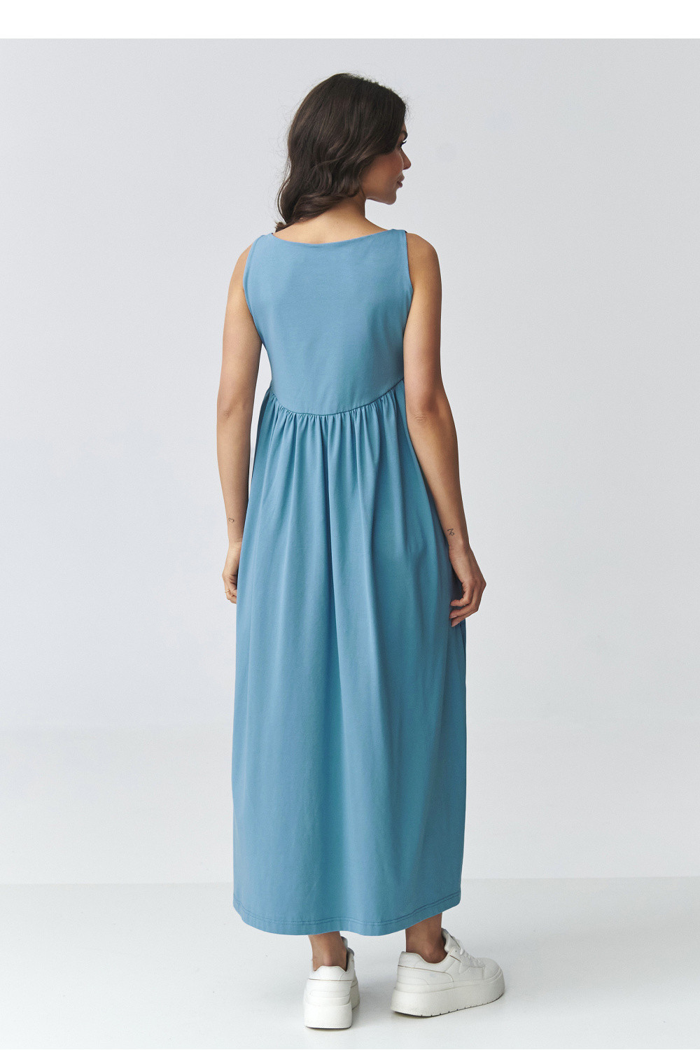 Elegantní maxi šaty s volným střihem jsou ideálním návrhem pro ženy, které ocení pohodlí a nadčasový design. Model má jemně rozšířený spodní lem a efektní rozparky po stranách, které dodávají lehkost a zdůrazňují postavu. Hladký tvar zaručuje, že šaty budou skvěle vypadat jak v každodenním nošení, tak i ve více elegantních stylizacích. Použitý prodyšný materiál zajišťuje pohodlí po celý den, zatímco volný střih zaručuje volnost pohybu. Praktické kapsy zvyšují funkčnost a zakrytý vrch s jemným rimplováním v pasu jemně modeluje proporce postavy. Jedná se o univerzální dlouhé dámské šaty, které snadno zkombinujete jak s sportovní obuví, tak i s elegantnějšími doplňky. Ideální na procházky, schůzky, dovolenou nebo každodenní nošení.