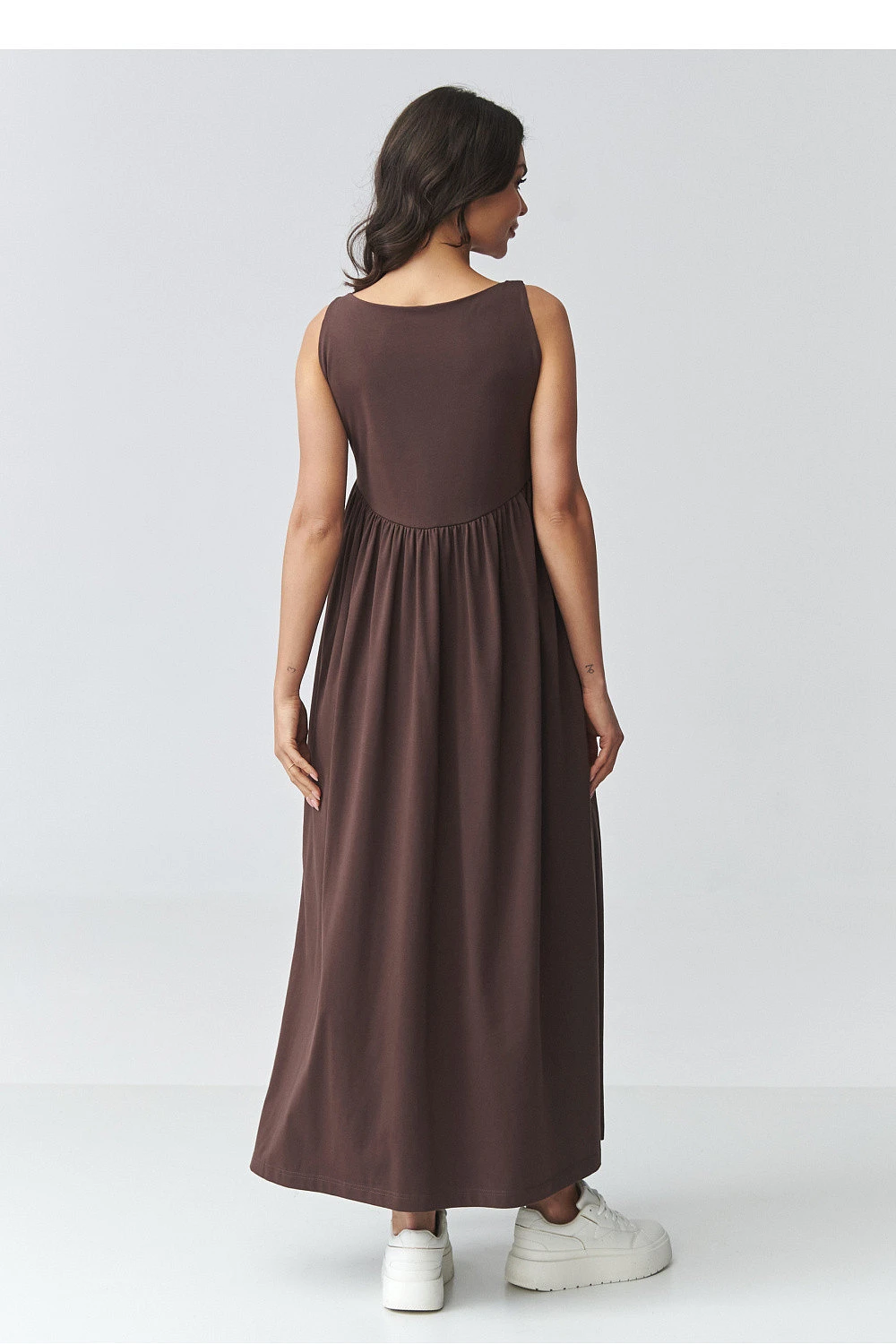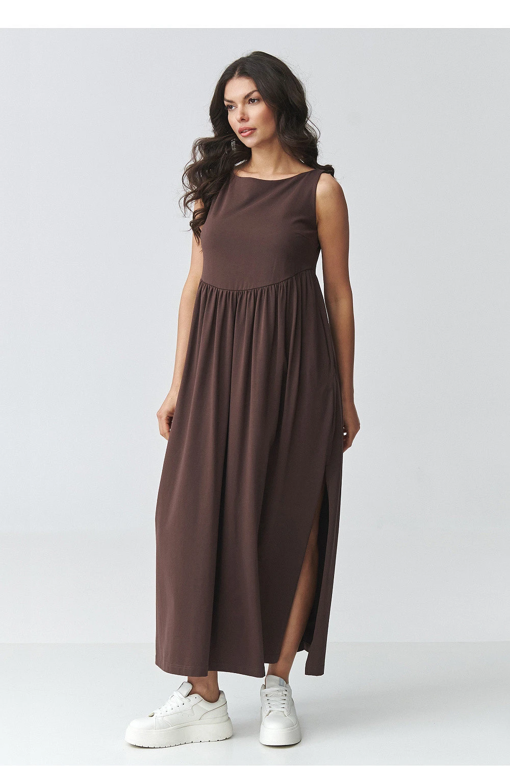 Elegantní maxi šaty s volným střihem jsou ideální volbou pro ženy, které ocení pohodlí a nadčasový design. Model má jemně rozšířený spodek a efektní rozřezání po stranách, které dodávají lehkost a zdůrazňují postavu. Hladký tvar zaručuje, že šaty budou skvěle vypadat jak v běžném životě, tak i ve více elegantních stylizacích. Použitý prodyšný materiál zajistí pohodlí při nošení po celý den a volný střih zaručí volnost pohybů. Praktické kapsy zvyšují funkčnost a zakrytý vrch s jemnými záhyby v pase decentně modeluje proporce postavy. Jedná se o univerzální dlouhé dámské šaty, které můžete snadno sladit jak s sportovní obuví, tak s elegantnějšími doplňky. Ideální na procházku, setkání, dovolenou nebo každodenní vycházky.