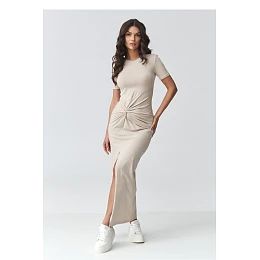 Elegantní šaty s ruchy jsou nabídkou pro ženy, které oceňují spojení klasiky a moderních detailů. Přiléhavý střih zdůrazňuje postavu, a jemné ruchy v pasu tvarují figuru a dodávají celku výjimečný charakter. Jedná se o ideální dámské šaty na speciální příležitosti, obchodní schůzky a stylové výstupy. Model má klasický, zakrytý výstřih a krátké rukávy, co z něj činí minimalistický a nadčasový vzhled. Dekorativní ruchy v centrální části krásně zdůrazňují pas, a efektní rozpark vpředu zeštíhluje nohy a přidává ženskou lehkost. Maxi délka činí z těchto šatů elegantní kousek vhodný na mnoho různých příležitostí. Vyrobené z elastického, pohodlného materiálu, přiléhavé šaty zaručují pohodlí přes celý den. Skvěle se hodí jak k sportovní obuvi v casualovém provedení, tak k elegantním doplňkům, tvořícím formální stylizaci.