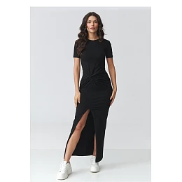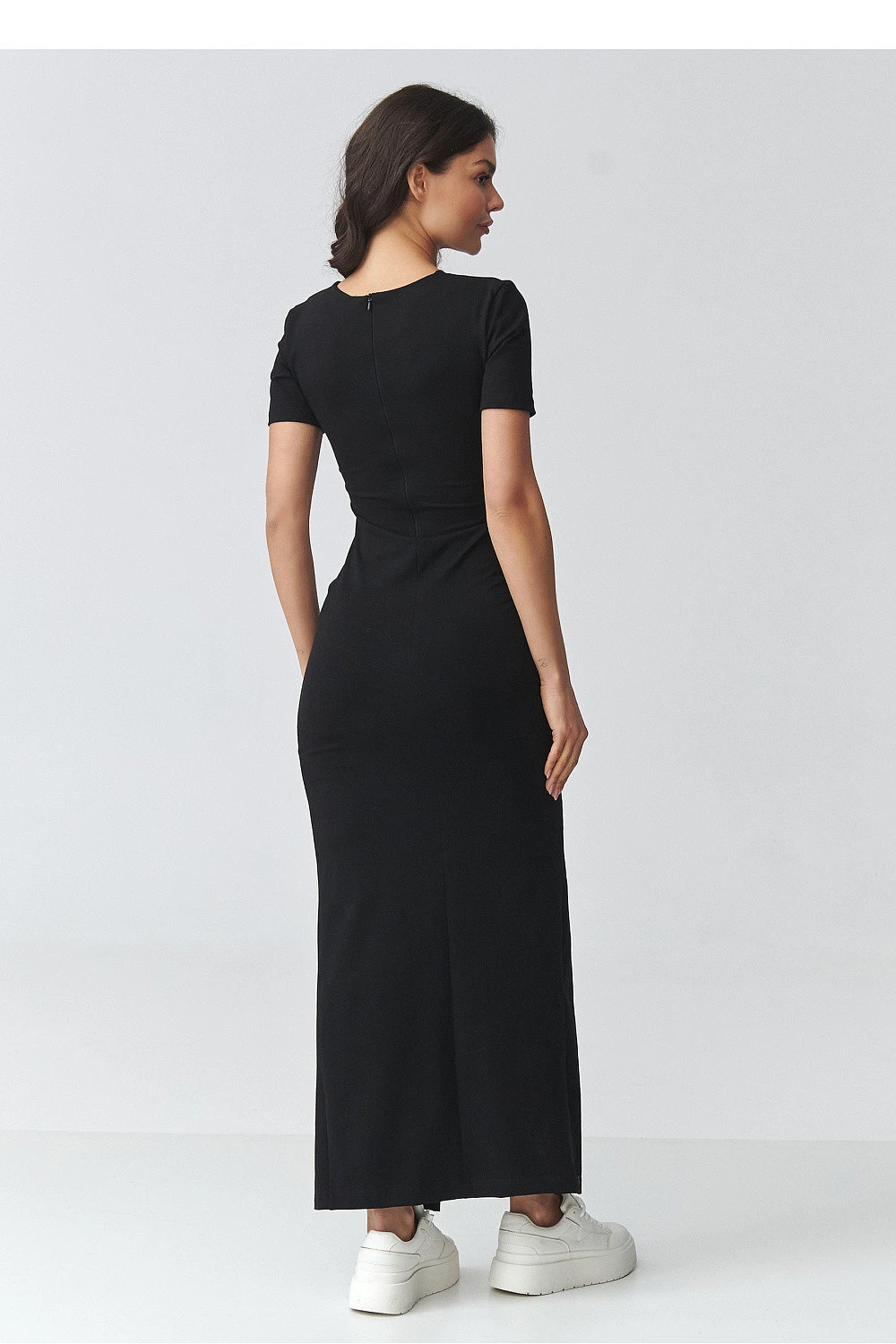 Elegantní šaty se záhybem jsou návrhem pro ženy, které oceňují kombinaci klasiky a moderních detailů. Střih podtrhuje siluetu a jemné záhyby v pasu tvarují postavu a dodávají celku výjimečný charakter. Jedná se o ideální dámské šaty na speciální příležitosti, obchodní setkání a stylové výlety. Model má klasický, zakrytý výstřih a krátké rukávy, což mu dává minimalistický a nadčasový vzhled. Ozdobné záhyby v centrální části krásně zdůrazňují pas, a efektní rozpark zepředu prodlužuje nohy a dodává ženskou lehkost. Maxi délka dělá z těchto šatů elegantní volbu pro mnoho různých příležitostí. Vyrobené z elastického, pohodlného materiálu, přiléhavé šaty zaručují pohodlí po celý den. Skvěle se hodí jak k sportovní obuvi v casualovém provedení, tak k elegantním doplňkům, vytvářejícím formální stylizaci.
