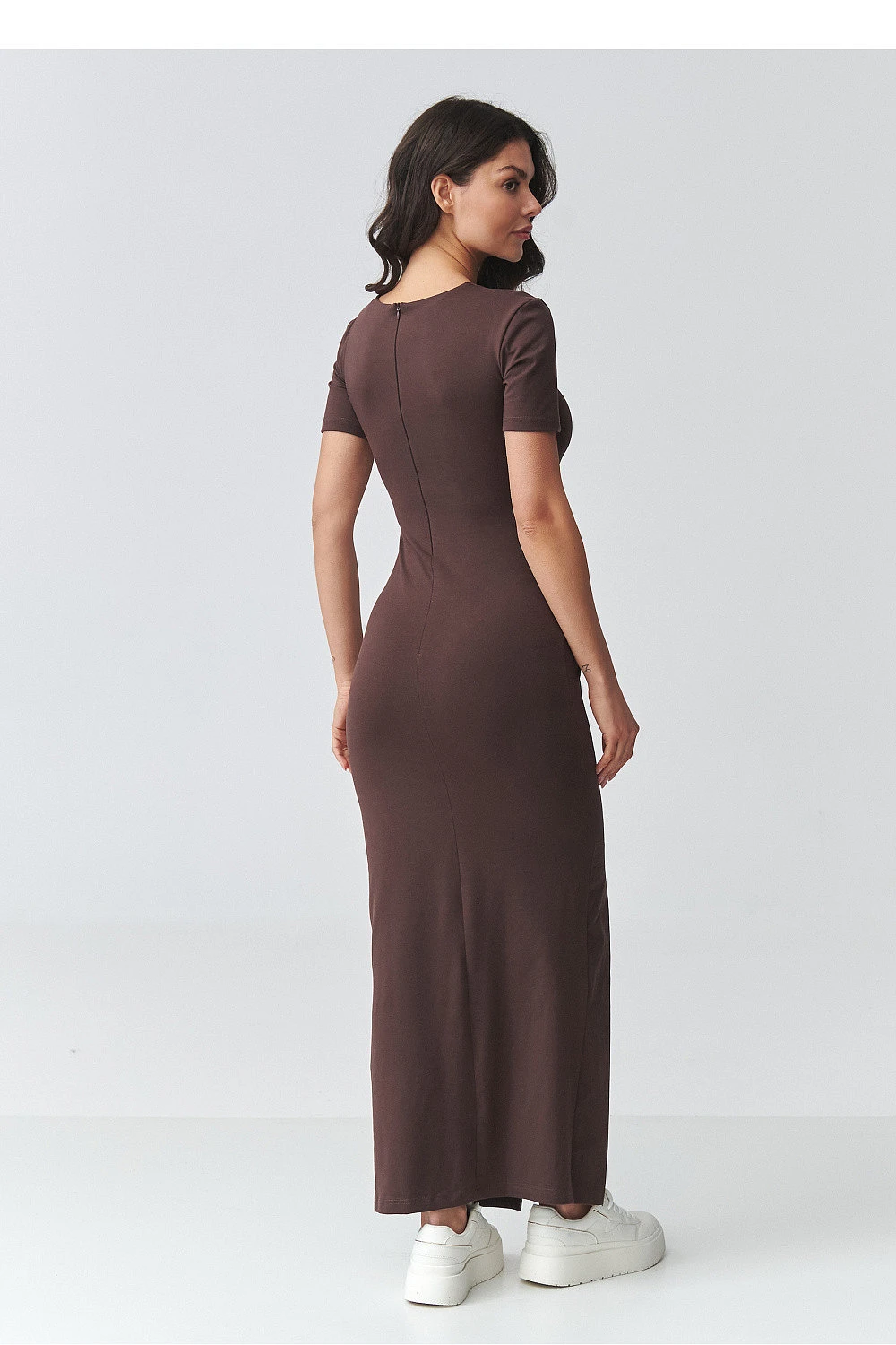 Elegantní sukně se zástřihem je nabídkou pro ženy, které oceňují kombinaci klasiky a moderních detailů. Přiléhavý střih zdůrazňuje postavu a jemné zástřihy v pasu modelují tvar a dodávají celku výjimečný charakter. Jedná se o ideální dámské šaty na speciální příležitosti, obchodní setkání a stylové výstupy. Model má klasický, zakrytý výstřih a krátké rukávy, což mu dodává minimalistický a nadčasový vzhled. Dekorativní zástřih v centrální části krásně zdůrazňuje pas, zatímco efektní rozřezání vpředu vytváří dojem delších nohou a dodává ženskou lehkost. Maxi délka dělá z těchto elegantních šatů vhodný k mnoha různým příležitostem. Vyrobené z elastického, pohodlného materiálu, přiléhavé šaty zaručují pohodlí po celý den. Skvěle se hodí jak k sportovní obuvi v casualovém provedení, tak k elegantním doplňkům, vytvářejíce tak formální stylizaci.