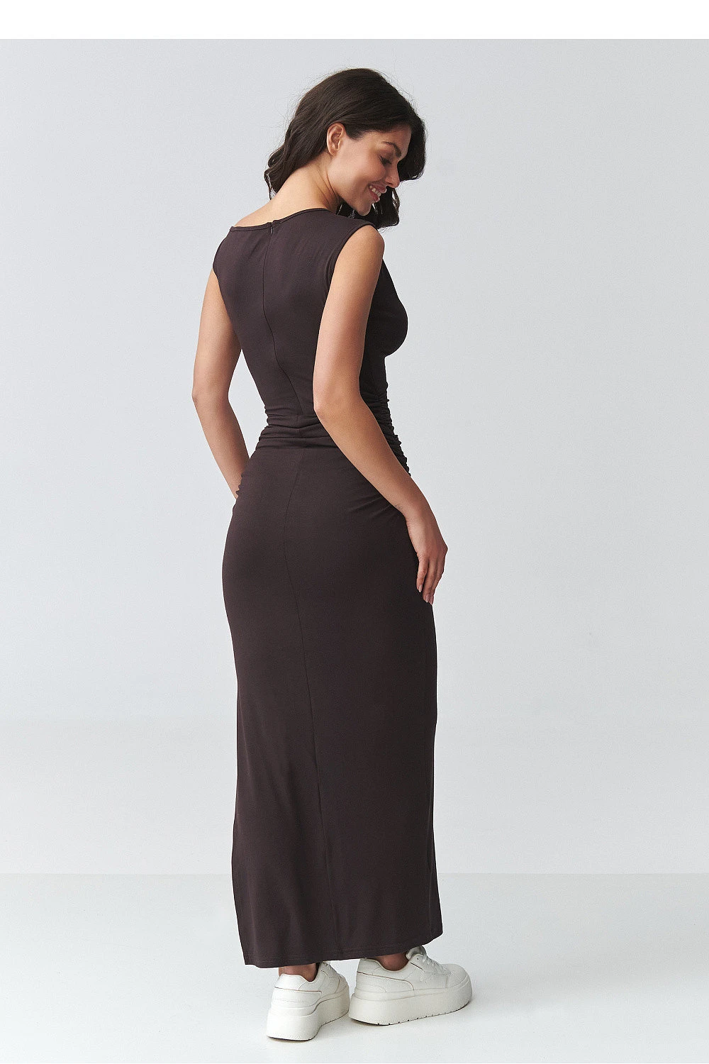 Tento přizpůsobený maxi šaty jsou ideální kombinací elegance a moderního stylu. Model s délkou po kotníky krásně zdůrazňuje postavu, zatímco jemné rýhy v pasu a na bocích opticky tvarují postavu, což zajišťuje efekt zeštíhlení. Je to skvělá volba pro ženy, které ocení elegantní večerní šaty s nadčasovým střihem. Horní část s jemným, lodním výstřihem zdůrazňuje ramena a krk, dodává stylizaci lehkost a ženský charakter. Bez rukávů se tento model skvěle hodí jak na slavnostní události, tak i na koktejlové stylizace. Vysoké rozštěpení na noze přidává celkovému vzhledu smyslnost a svobodu pohybu. Vyrobené z elastického, příjemného na dotek materiálu, přizpůsobené šaty ke střihu zajišťují pohodlí při nošení po celý den nebo večer. Jsou to ideální šaty na svatbu, šaty na večírek a také stylový návrh na rande nebo elegantní večeři. Vsad na ženské maxi šaty s rozštěpením, které zdůrazní tvoje výhody a poskytne ti pocit výjimečnosti v každé situaci.