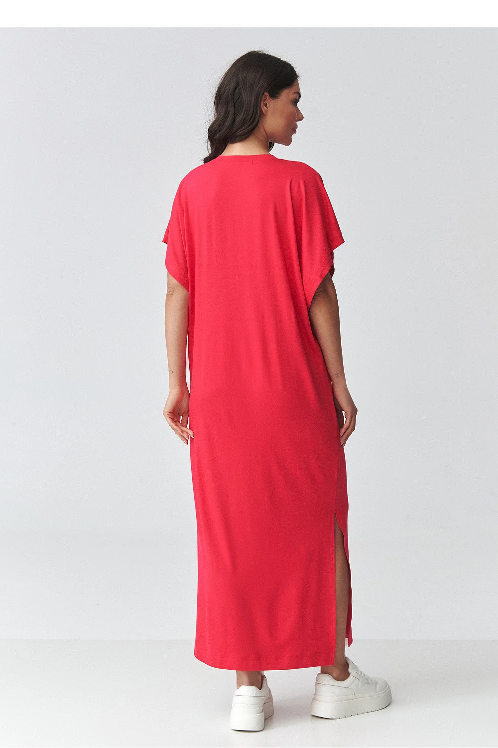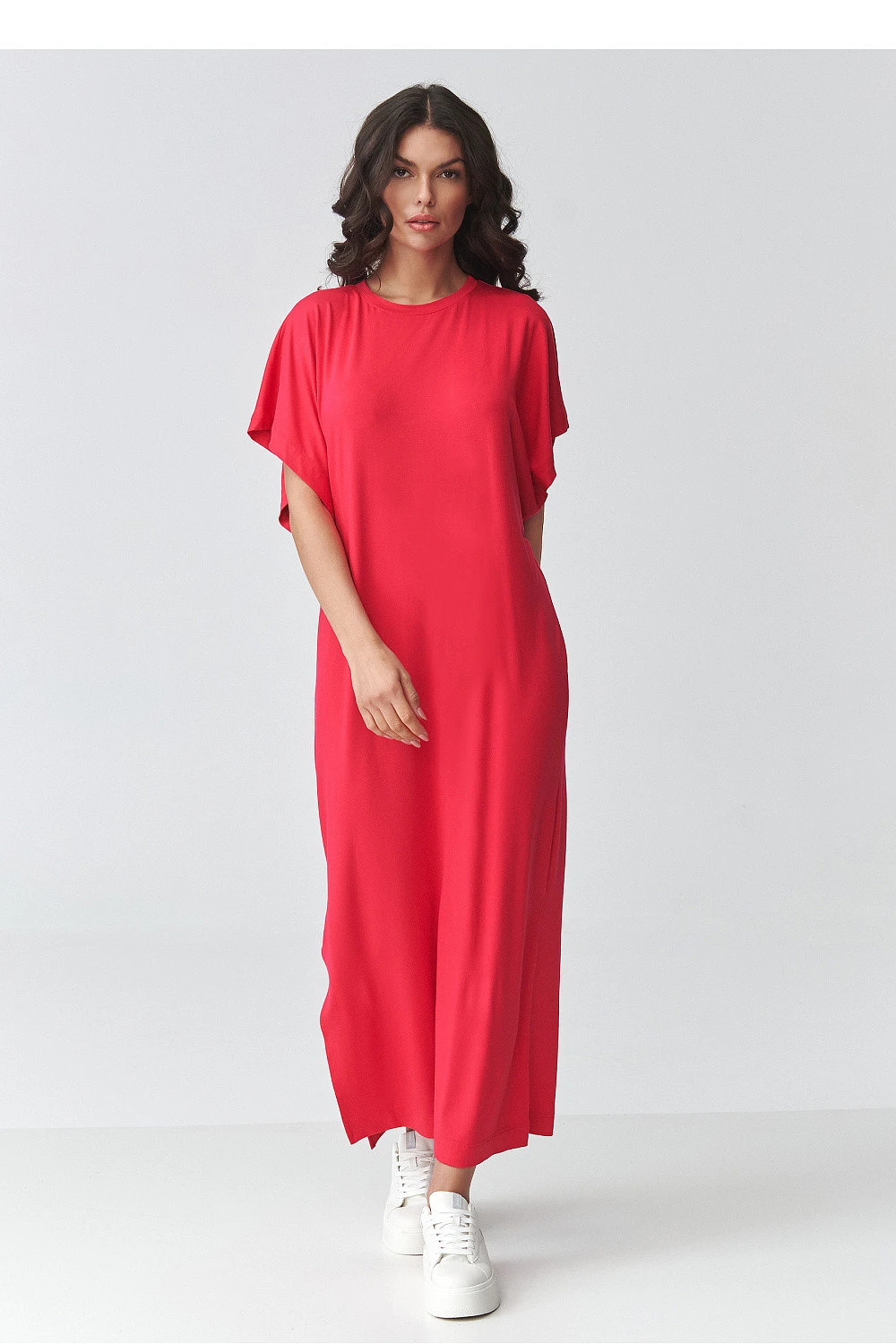 Elegantní maxi oversize šaty jsou skvělou kombinací pohodlí a moderního minimalismu. Volný střih poskytuje volnost pohybu a jednoduchý střih skvěle padne na různé typy postavy. Ideální volba pro ženy, které ocení pohodlí a nadčasový styl. Model má klasický, zakrytý výstřih a krátké, široké rukávy, které zdůrazňují ležérní charakter outfitu. Délka maxi spojená s efektním rozporkem na boku dodává lehkost a decentně zdůrazňuje nohu, celkově dodává outfitu ženský nádech. Měkký, příjemný na dotek materiál zaručuje, že tyto dámské šaty budou vhodné jak do práce, tak na procházky nebo setkání s přáteli. Univerzální dlouhé šaty s rozporkem, které můžete stylovat různými způsoby, buď s teniskami pro sportovní vzhled, nebo s elegantními doplňky pro sofistikovanější efekt. Díky jednoduchému střihu jsou skvělým základem pro tvorbu módních outfitů po celou sezónu.