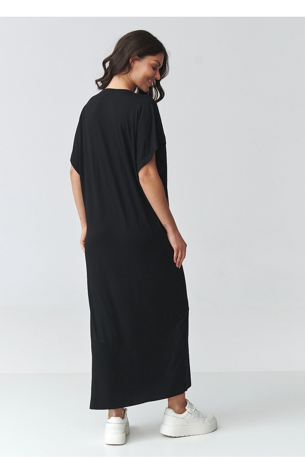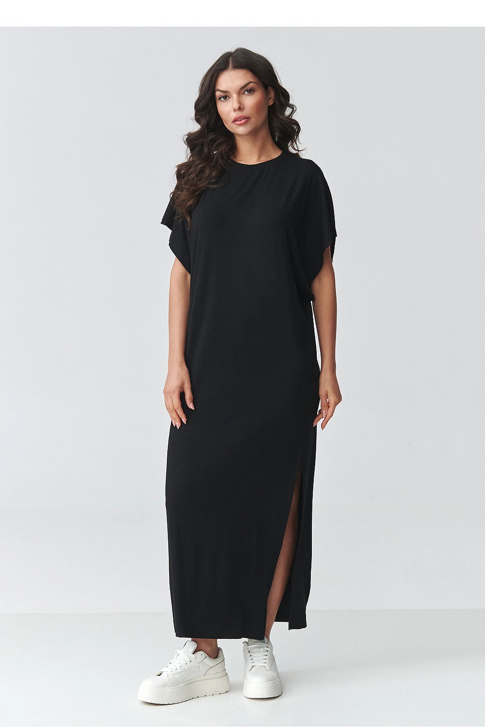 Elegantní oversized maxi šaty jsou skvělou kombinací pohodlí a moderního minimalismu. Volný střih poskytuje volnost pohybu a jednoduchý střih se skvěle přizpůsobuje různým typům postav. Ideální volba pro ženy, které oceňují pohodlí a nadčasový styl. Model má klasický výstřih a krátké široké rukávy, které zdůrazňují ležérní charakter outfitu. Maxi délka ve spojení s efektním rozparkem po straně dodává lehkost a decentně vystavuje nohu, což celkově přidává ženský výraz. Měkký a příjemný materiál v dotyku dělá tyto dámské šaty vhodné jak do práce, tak na procházky nebo setkání s přáteli. Univerzální dlouhé šaty s rozparkem, které můžete stylovat různými způsoby, s teniskami ve sportovním stylu nebo s elegantními doplňky pro sofistikovanější efekt. Díky jednoduchému střihu poskytují tyto šaty skvělou základnu pro vytváření módních outfitů po celou sezónu.