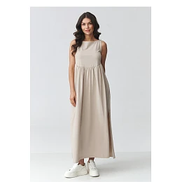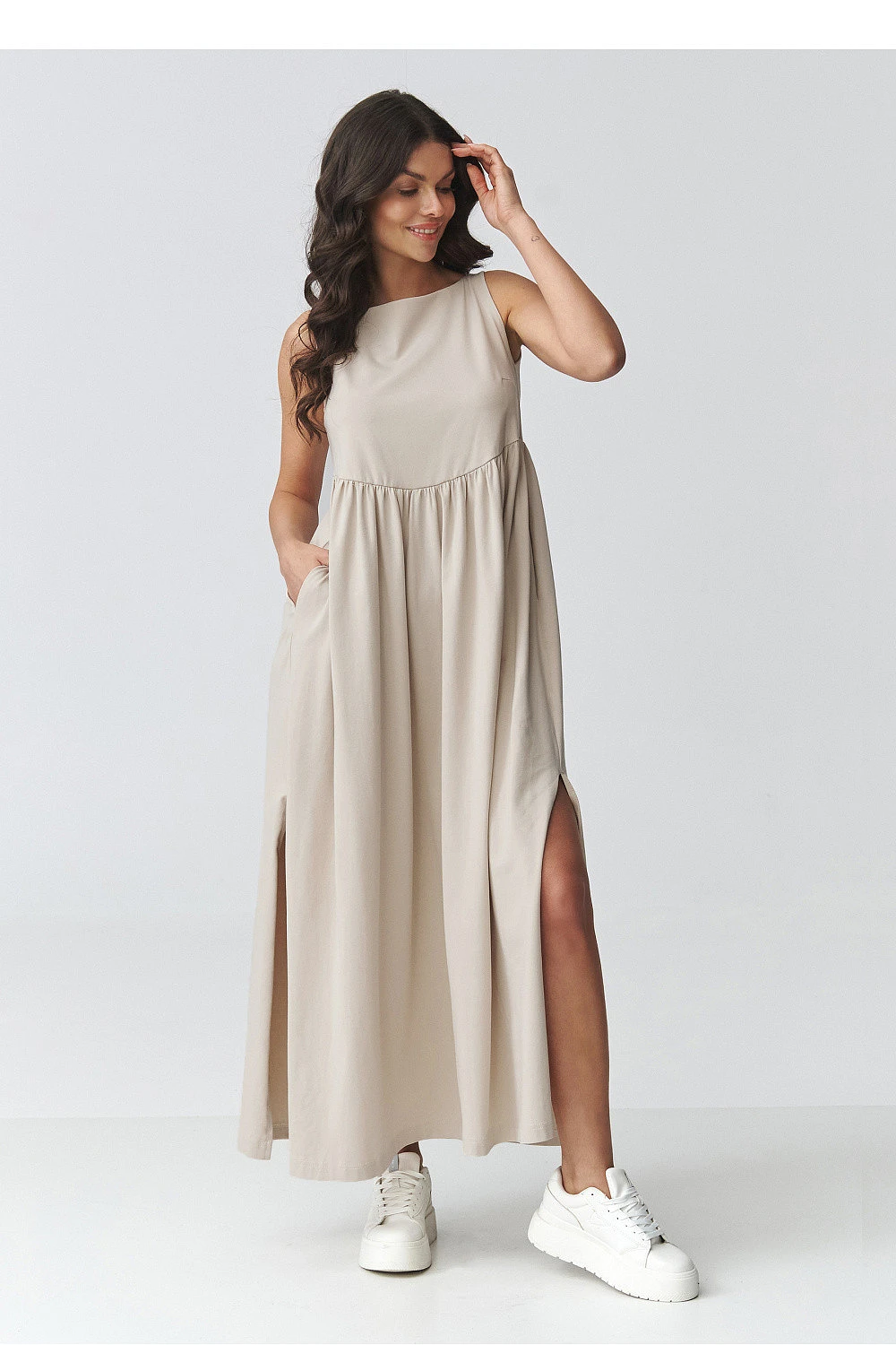 Elegantní maxi šaty s volným střihem jsou ideální volbou pro ženy, které ocení pohodlí a nadčasový design. Model má decentně rozšířený spodek a efektní rozparky po stranách, které dodávají lehkost a zdůrazňují postavu. Hladký tvar dělá šaty ideální jak do každodenního nošení, tak do elegantních stylizací. Použitý prodyšný materiál zajišťuje pohodlí po celý den a volný střih zaručuje volnost pohybů. Praktické kapsy zvyšují funkčnost, a zastřený vršek s jemnými záhyby v pasu jemně tvaruje proporce postavy. Jedná se o univerzální dlouhé dámské šaty, které můžete snadno sladit jak se sportovní obuví, tak s elegantnějšími doplňky. Ideální na procházku, schůzku, dovolenou nebo každodenní vycházky.