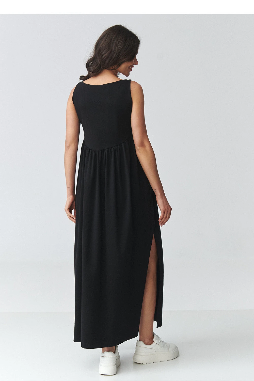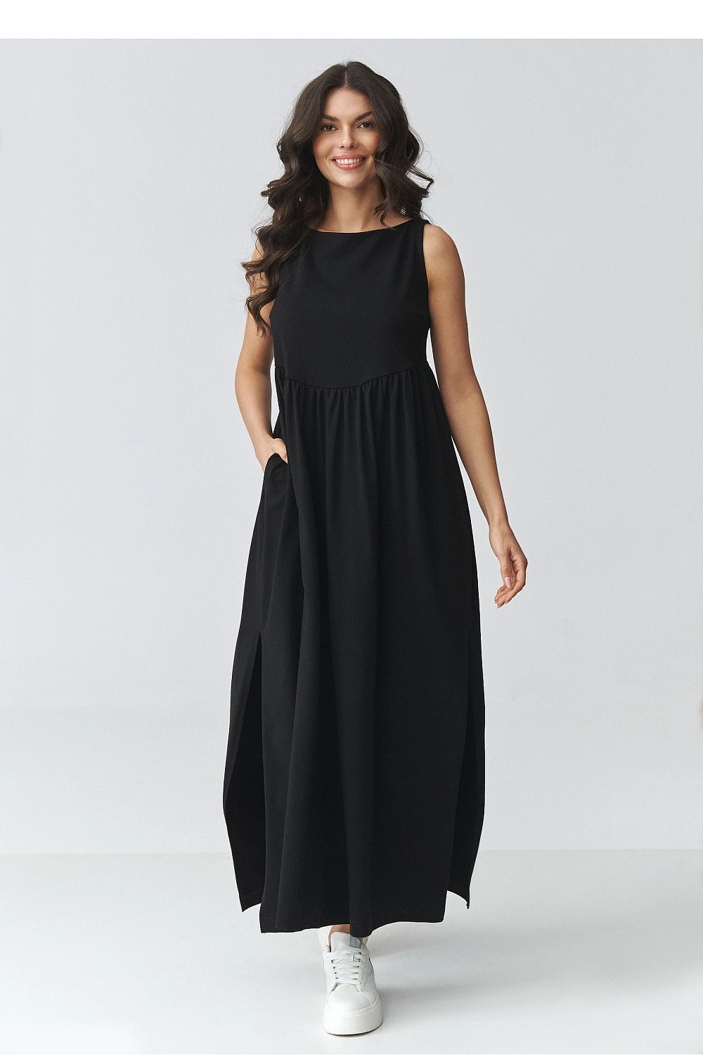 Elegantní maxi šaty volného střihu jsou ideálním návrhem pro ženy, které ocení pohodlí a nadčasový design. Model má decentně rozšířený spodek a efektní rozříznutí po stranách, které dodávají lehkost a zdůrazňují postavu. Hladký tvar zaručuje, že šaty budou skvěle vypadat jak ve dne, tak i v elegantnějších stylizacích. Použitý prodyšný materiál zajišťuje pohodlí po celý den a volný střih zaručuje volnost pohybů. Praktické kapsy zvyšují funkčnost, a zabudovaná horní část s jemným ruchem v pasu jemně modeluje proporce postavy. Jedná se o univerzální dlouhé dámské šaty, které můžete snadno sladit jak s sportovní obuví, tak s elegantnějšími doplňky. Ideální na procházku, schůzku, dovolenou nebo každodenní vycházky.