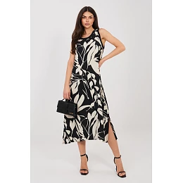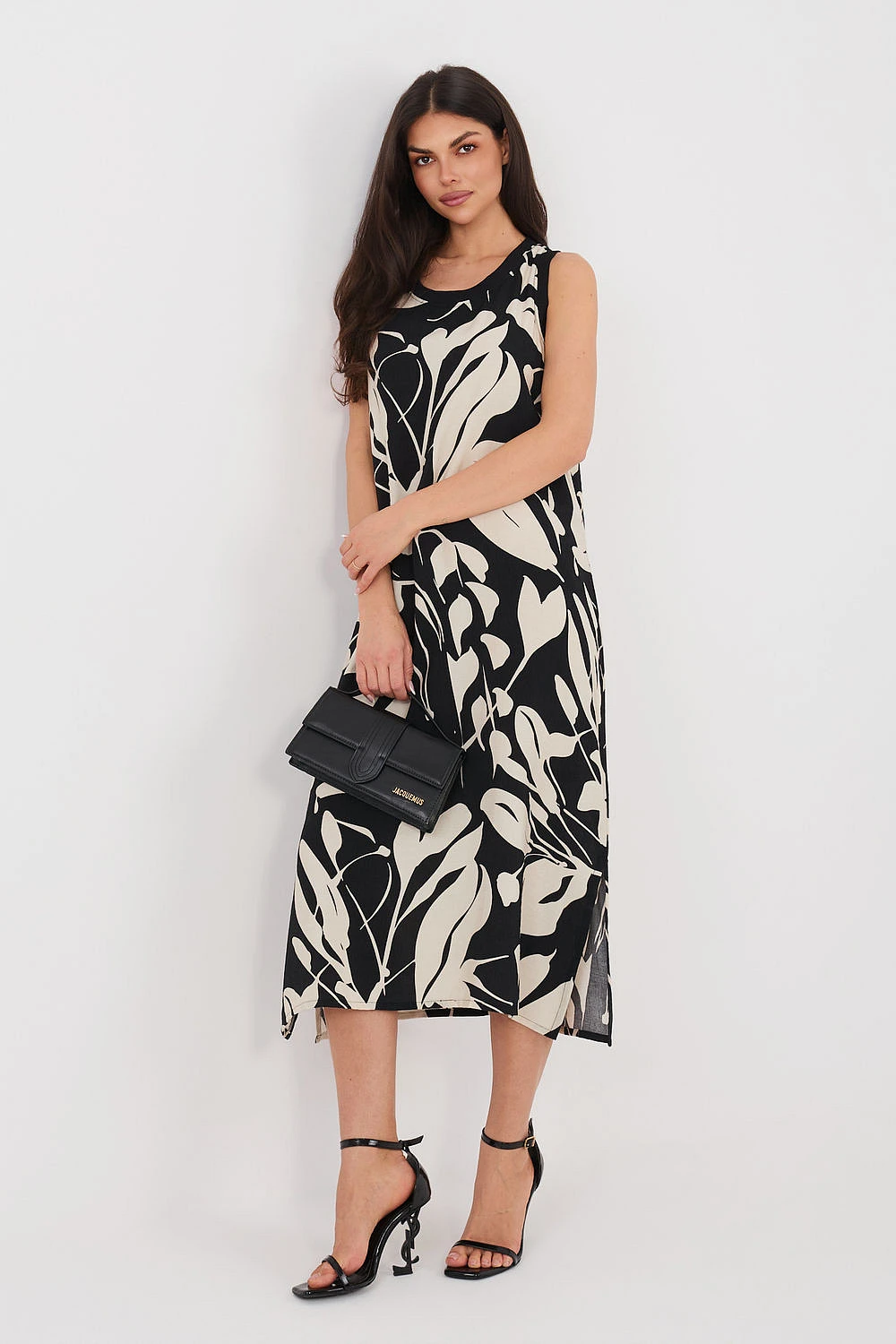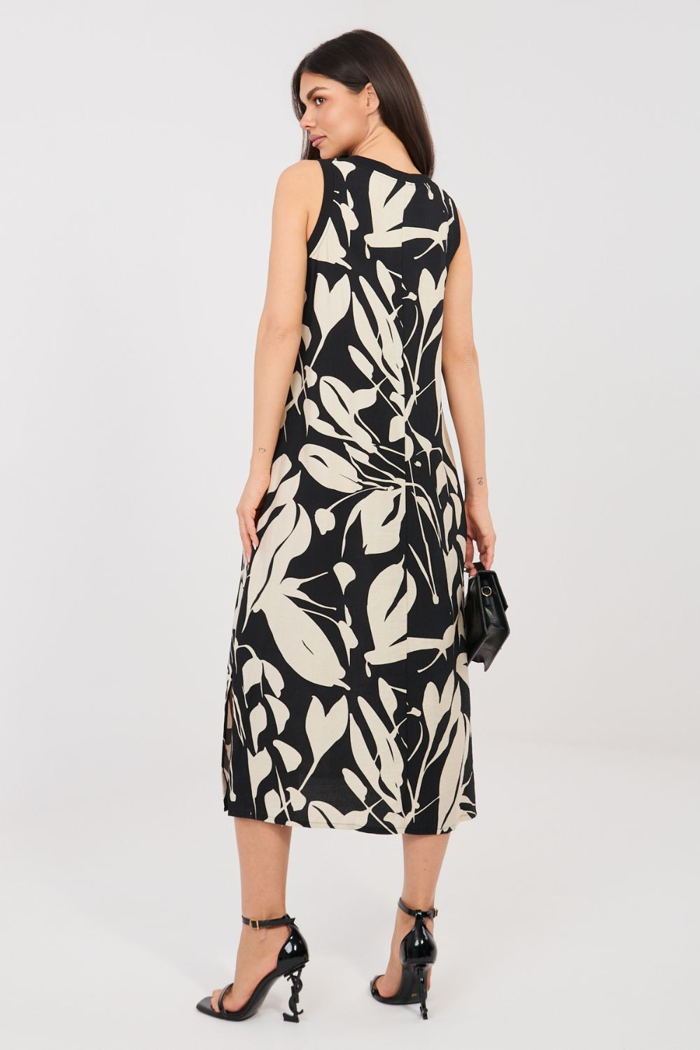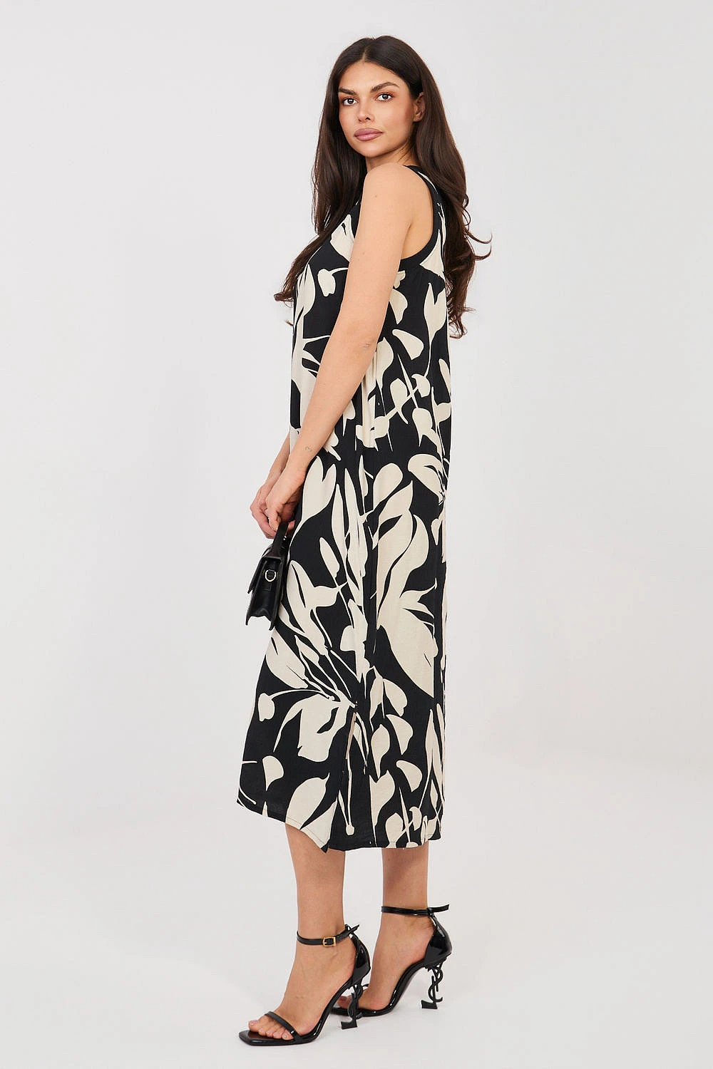 Lehké a stylové letní šaty jsou skvělým návrhem na teplé dny. Skvěle se hodí do každodenních outfitů na procházky, setkání s přáteli nebo dovolenou. Jejich volný střih poskytuje pohodlí a módní vzhled. Model je vyroben z kombinace viskózy a polyamidu, díky čemuž je materiál příjemný k pokožce, prodyšný a dobře padne na postavě. Šaty mají kulatý výstřih a bezrukávový střih, což zajišťuje pohodlí i v horkých dnech. Celý model zdobí efektní rostlinný potisk, který dává šatům letní, svěží charakter. Midi délka zase zajišťuje eleganci a zároveň zůstává velmi pohodlná a univerzální. Jsou to ideální šaty na každodenní vycházky, které vám umožní vytvořit lehký, ženský outfit na léto.