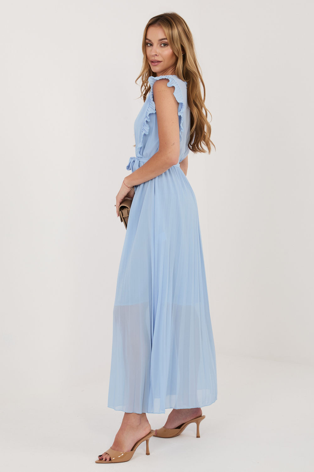 Rozklosowana midi šaty jsou ideální volbou na letní dny, spojující lehkost, pohodlí a ženský styl. Skvěle se hodí do každodenních outfitů, poskytují volnost pohybu a elegantní vzhled. Model vyrobený z vysoké kvality směsi polyesteru, viskózy a elastanu je lehký, příjemný na dotek a dobře padne na postavě. Hladký vzor zdůrazňuje univerzální charakter šatů, díky čemuž se s nimi snadno sladíte s různými doplňky. Šaty mají přesýpací výstřih, který jemně zdůrazňuje krk a dodává celku ženskou eleganci. Bez rukávů se model skvěle hodí do teplých dní. V pasu je šňůrkování ve formě šátku, které umožňuje ideální přizpůsobení a zdůraznění postavy. K šatům dodávají zvláštní charakter ozdobné volány po stranách v horní části šatů, které jim dodávají lehkost a romantický styl. Spodek od pasu je plisovaný, což se krásně skládá v pohybu a zdůrazňuje rozevřený střih. Další výhodou je podšívka dlouhá po kolena, která zvyšuje pohodlí nošení a zajišťuje lepší uspořádání materiálu. To je skvělá volba pro ženy, které oceňují styl, pohodlí a jemné ženské detaily ve svých letních outfitech.