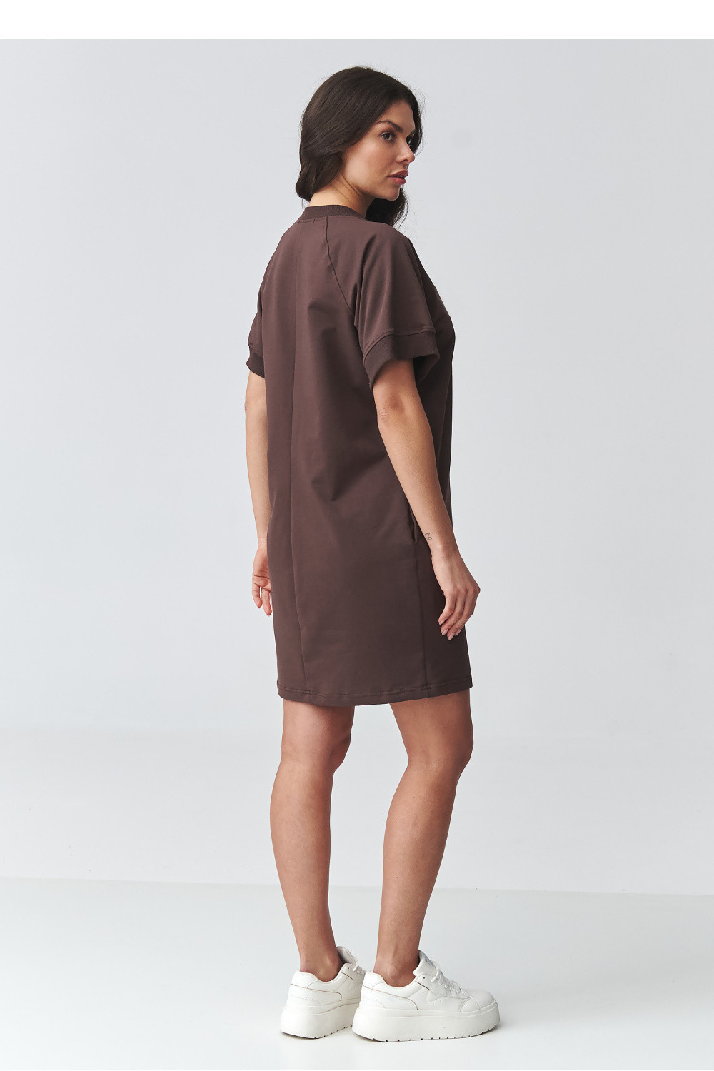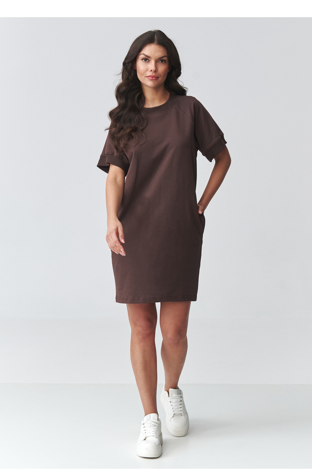 Stylové a neuvěřitelně pohodlné oversized dresové šaty jsou ideální volbou pro ženy, které ocení spojení pohodlí a módního vzhledu. Volný střih zajišťuje plnou volnost pohybu a minimalistický střih zase zaručuje, že se model skvěle hodí do každodenních stylizací. Model má krátký rukáv a klasický, zakrytý výstřih, což mu dodává univerzální charakter. Další výhodou jsou praktické kapsy po stranách, které zvyšují funkčnost a pohodlí užívání. Díky vhodné délce se tyto šaty skvěle hodí jak samy o sobě, tak i v kombinaci s oblíbenými doplňky. Jsou to skvělé každodenní casual šaty, které se hodí na procházky, nákupy, cestování nebo setkání v uvolněné atmosféře. Můžeš je nosit se teniskami, keckami nebo elegantnějšími botami, vytvářející různorodé stylizace.