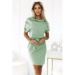 Když plánujete jít do práce, na schůzku nebo na rodinnou událost, tato pistáciová šaty vám pomohou rychle vytvořit souvislý outfit. Klasický střih zajišťuje, že tyto úzké šaty vypadají dobře s saka, podpatky nebo sandály. Jedná se o praktické šaty s páskem, které zdůrazňují pas a poskytují pohodlí po celý den. Model má široký, jemně padající výstřih a krátké rukávy s efektním drapováním na ramenech. V pasu je šňůra z stejné látky, která umožňuje nastavit obvod. Spodek má přímou, úzkou linii a délka sahá před kolena, což je ideální jak do denního outfitu, tak do více elegantních příležitostí. Vyrobeno v Polsku.