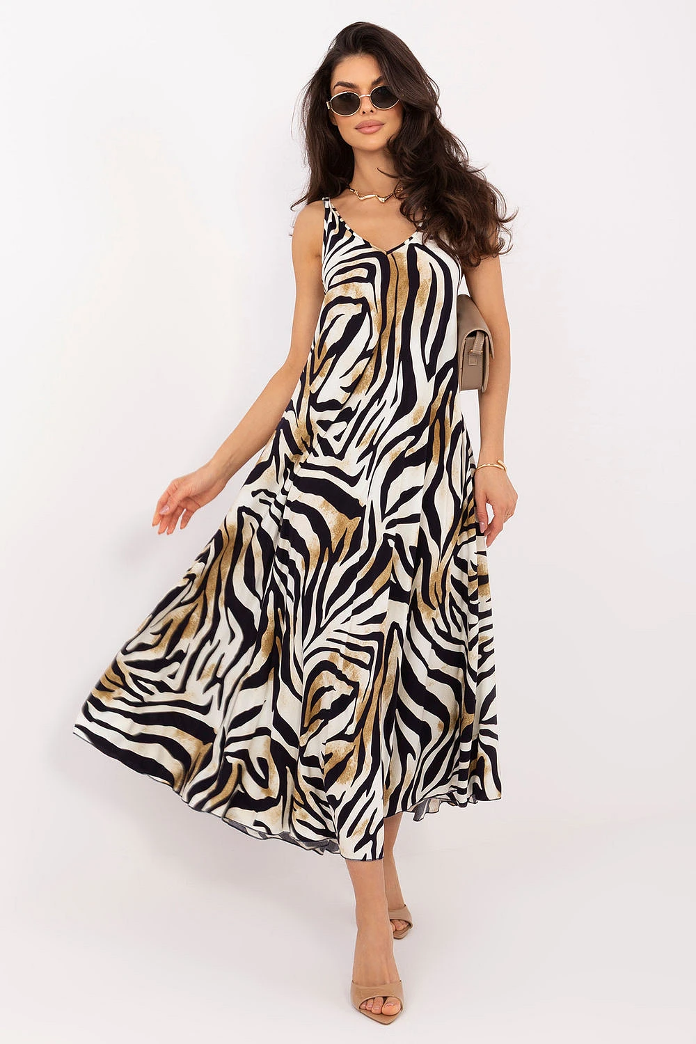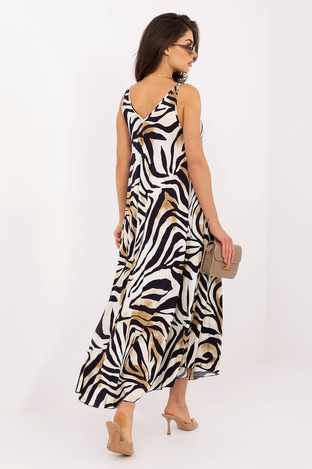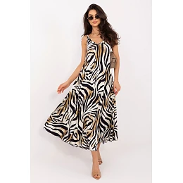 Šaty na léto ve střihu roztančeného kroje jsou lehkým a efektním návrhem ideálním pro každodenní styling. Jejich volný střih krásně padne na postavě, poskytujíc pohodlí a prodyšnost i v teplejších dnech. Model maxi délky přitahuje pozornost moderním potiskem, který dodává celku výrazný a stylový charakter. Výstřih do V decentně zdůrazňuje linii krku a dodává šatům ženskou lehkost. Vyrobena z příjemné viskózy, šaty jsou prodyšné, měkké a pohodlné na nošení. Bez rukávů a bez zapínání je model pohodlný a praktický v každodenním nošení. Jedná se o skvělou volbu na letní dny, kombinující volnost, pohodlí a moderní, výrazný styl.