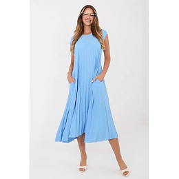 Elegantní plisované šaty s nadčasovým charakterem, které se skvěle hodí do mnoha stylizací od práce, přes oficiální schůzky až po speciální události a večírky. Model midi délky vyrobený z hladkého materiálu se jemně skládá kolem postavy a plisované spodní části dodává lehkost a ženskou eleganci. Šaty mají kulatý výstřih a jsou bez rukávů, co jim dodává univerzální a moderní vzhled. Na zádech je zapínání na knoflík, které usnadňuje oblékání a dodává estetické zakončení. Další výhodou jsou praktické kapsy v bočních švech, které zvyšují funkcionalitu modelu. Vyrobena z polyesterové směsi a elastanu, šaty zajistí pohodlí, odolnost a volnost pohybu. Je to stylový a univerzální návrh pro ženy, které ocení eleganci a pohodlí.