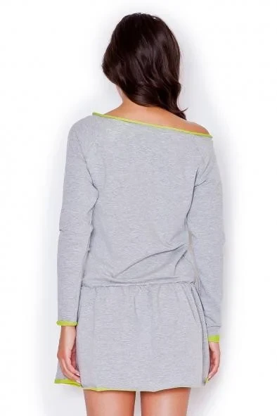 Neobvyklé šaty sportovního střihu. Rozdělené v pase a svázané šňůrkou. Rukávy jsou zakončené švy. Mini délka svůdně odhaluje nohy. Šaty jsou vyrobeny z teplákového úpletu. Ideální volba pro každodenní nošení. Věnováno mladým, dynamickým ženám.