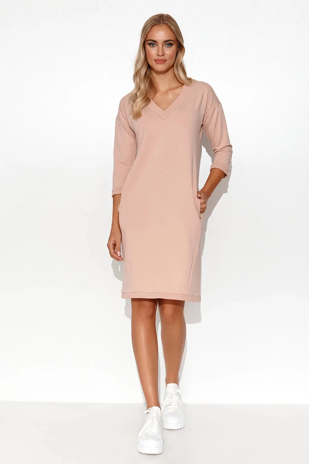 Teplákové šaty jednoduchého, ležérního střihu. Mají hluboký výstřih do V, 3/4 rukávy a praktické boční kapsy. Na jedné z nich je našitý ozdobný zlatý štítek. Šaty mají žebrované lemy, které dodávají sportovní nádech. Zadní díl šatů je hladký, se skrytým švem umístěným uprostřed. Perfektní letní volba, kterou můžete nosit s lehkými teniskami nebo sportovními sandály pro aktivní den.