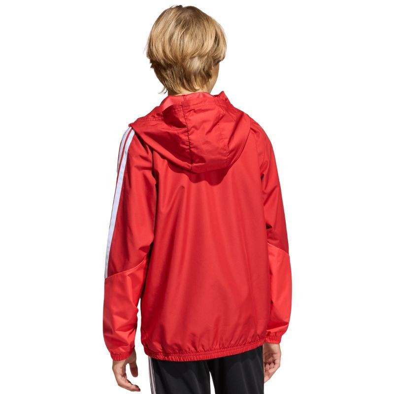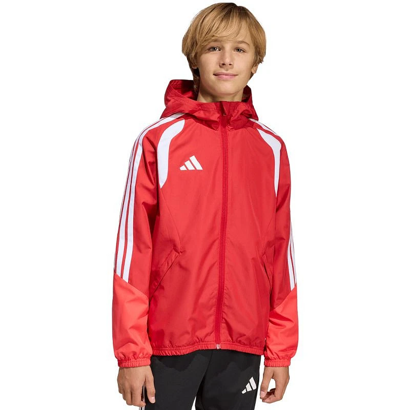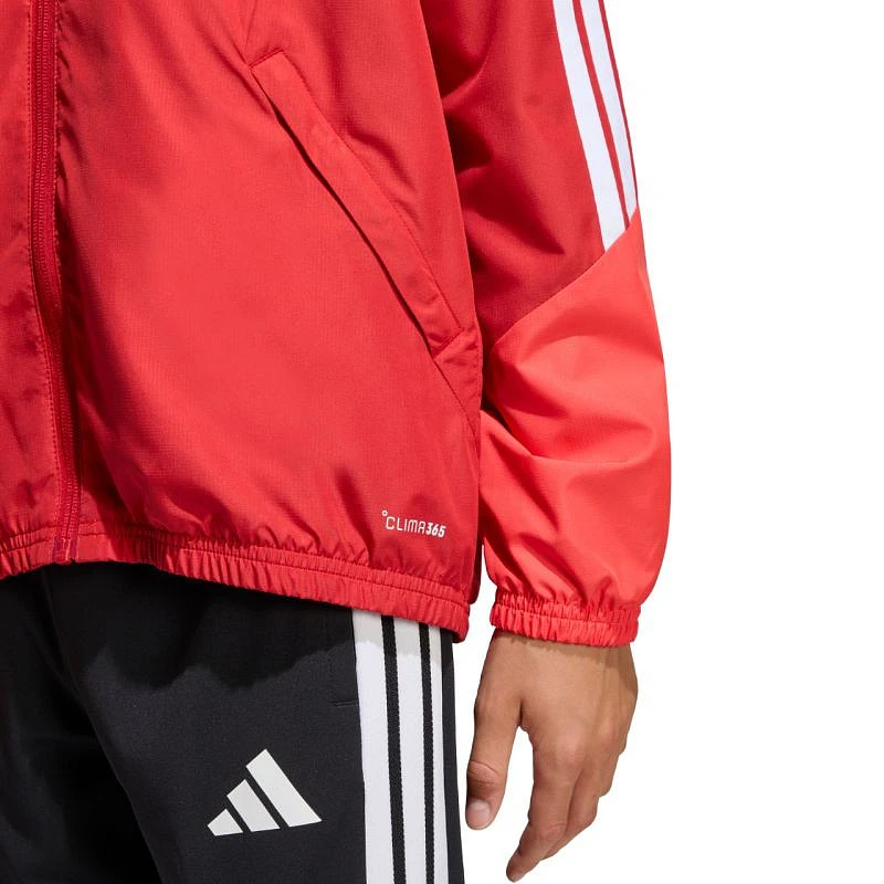 Dětská bunda adidas Tiro 26 Competition All Weather v červené barvě KB0155 Dětská bunda adidas Tiro je ideální na trénink, má zip po celé délce pro rychlé oblékání. Ochranná nášivka na bradu. Nenastavitelná kapuce. Vodoodpudivé vlastnosti. Větruodolná. Technické specifikace:- Materiál: 100% polyester (recyklovaný)- Standardní střih- Zip po celé délce- Technologie CLIMA365- Přední kapsy na zip- Kapuce- Elastické manžety a spodní lem.